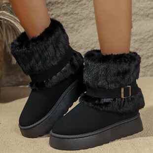 厚底加绒加厚防滑棉鞋 毛毛皮带扣复古保暖雪地靴女2025冬季 新款