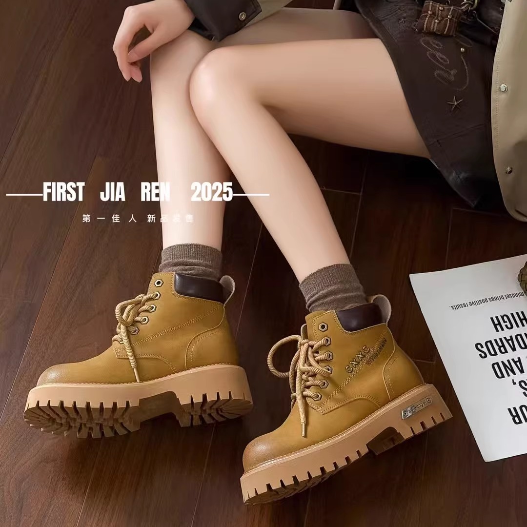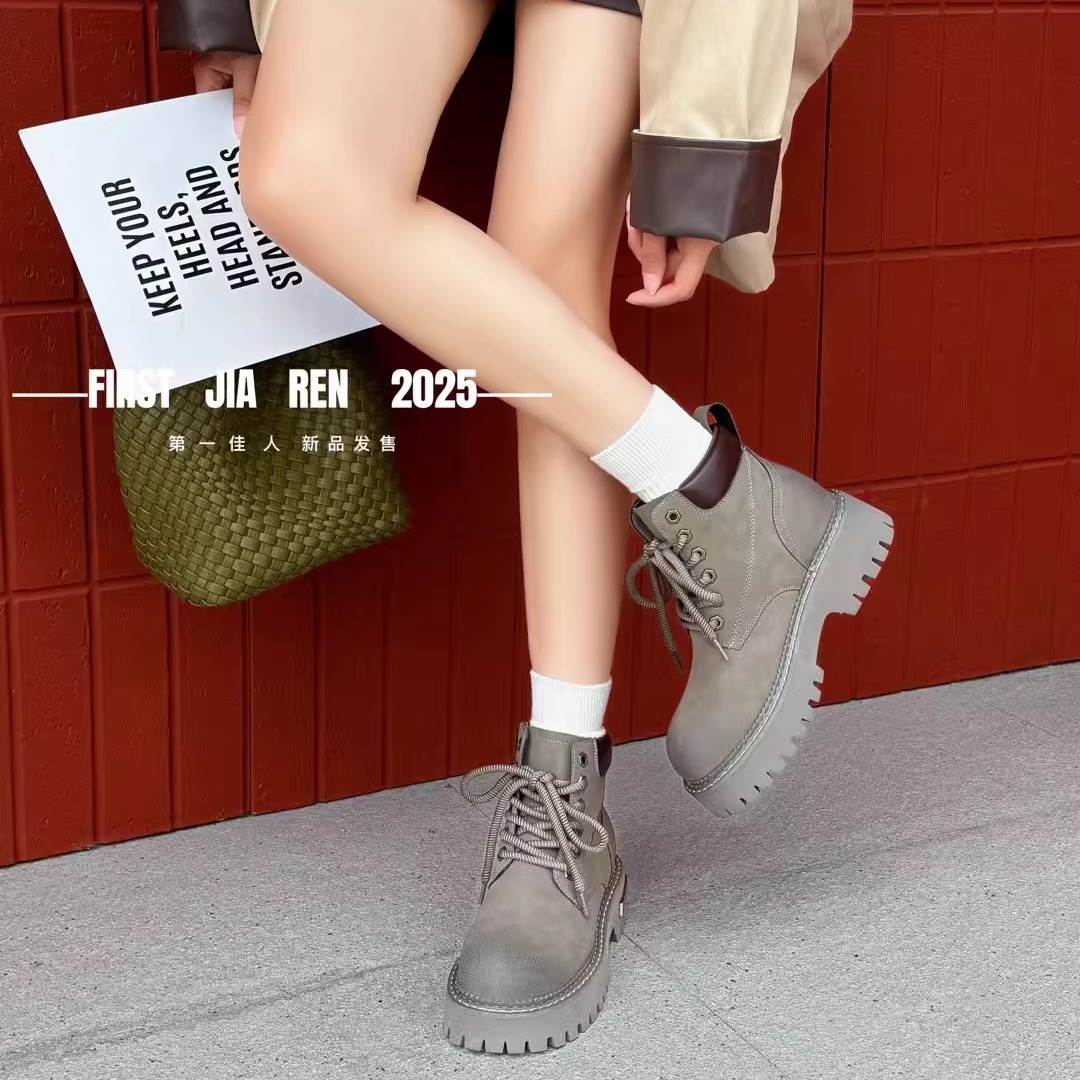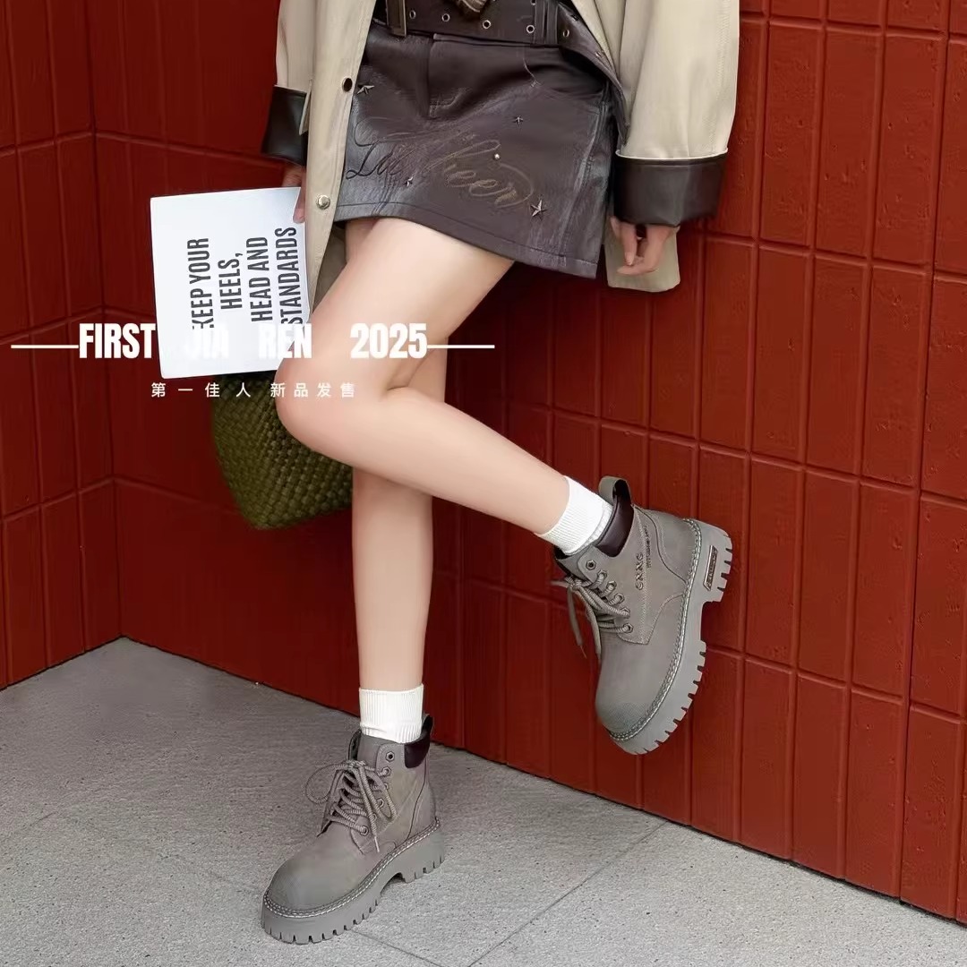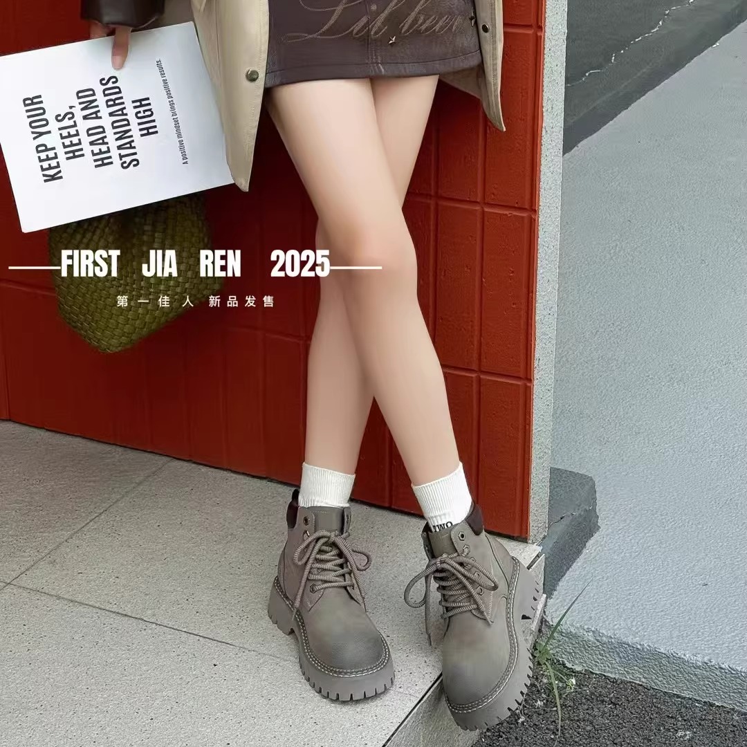 短靴 方跟 圆头 一代佳人 马丁靴 女鞋 休闲靴 系带 2025早秋新款