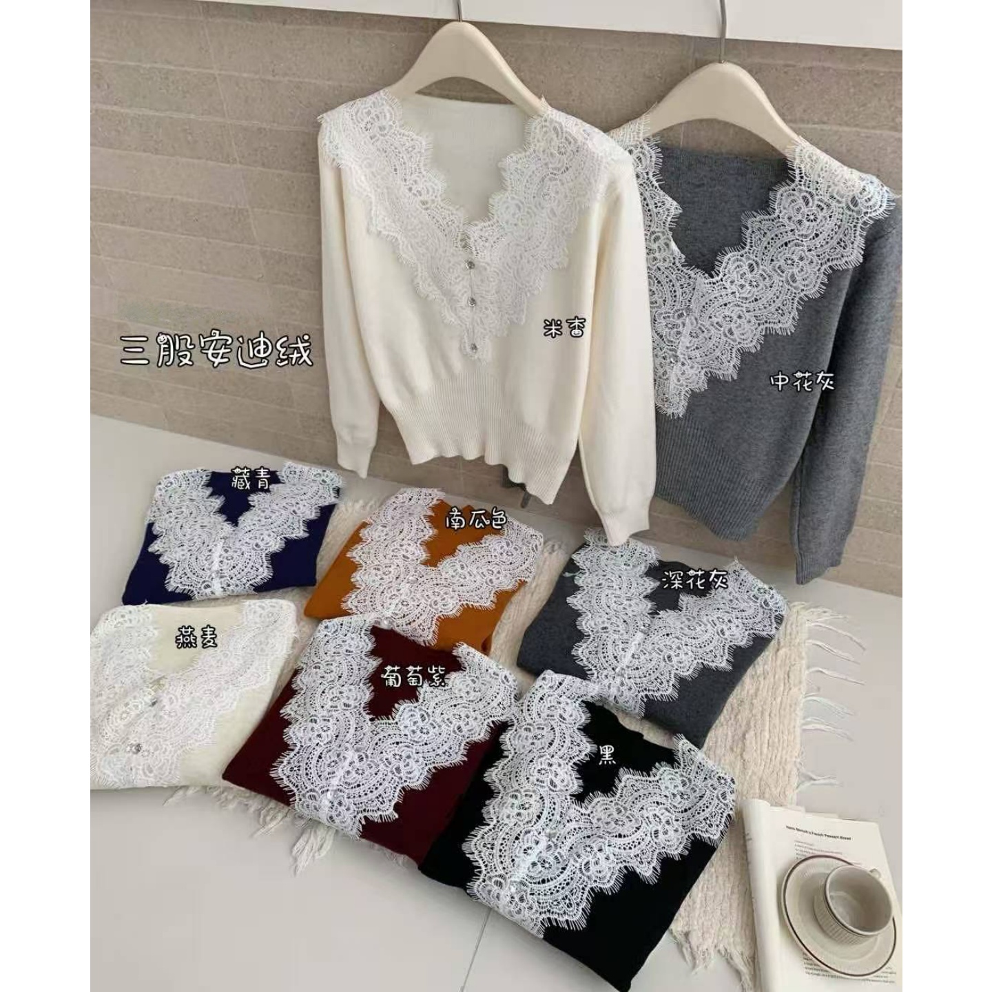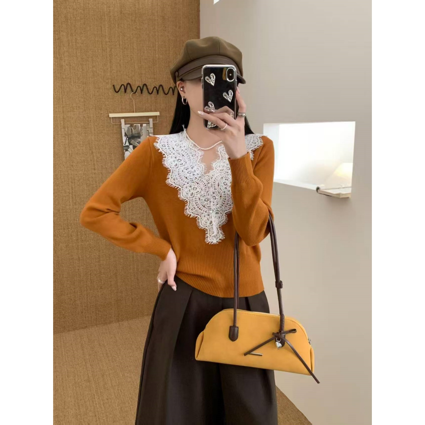 纯欲辣妹蕾丝拼接v领高腰毛衣针织打底衫 绝美上 女内搭秋冬长袖