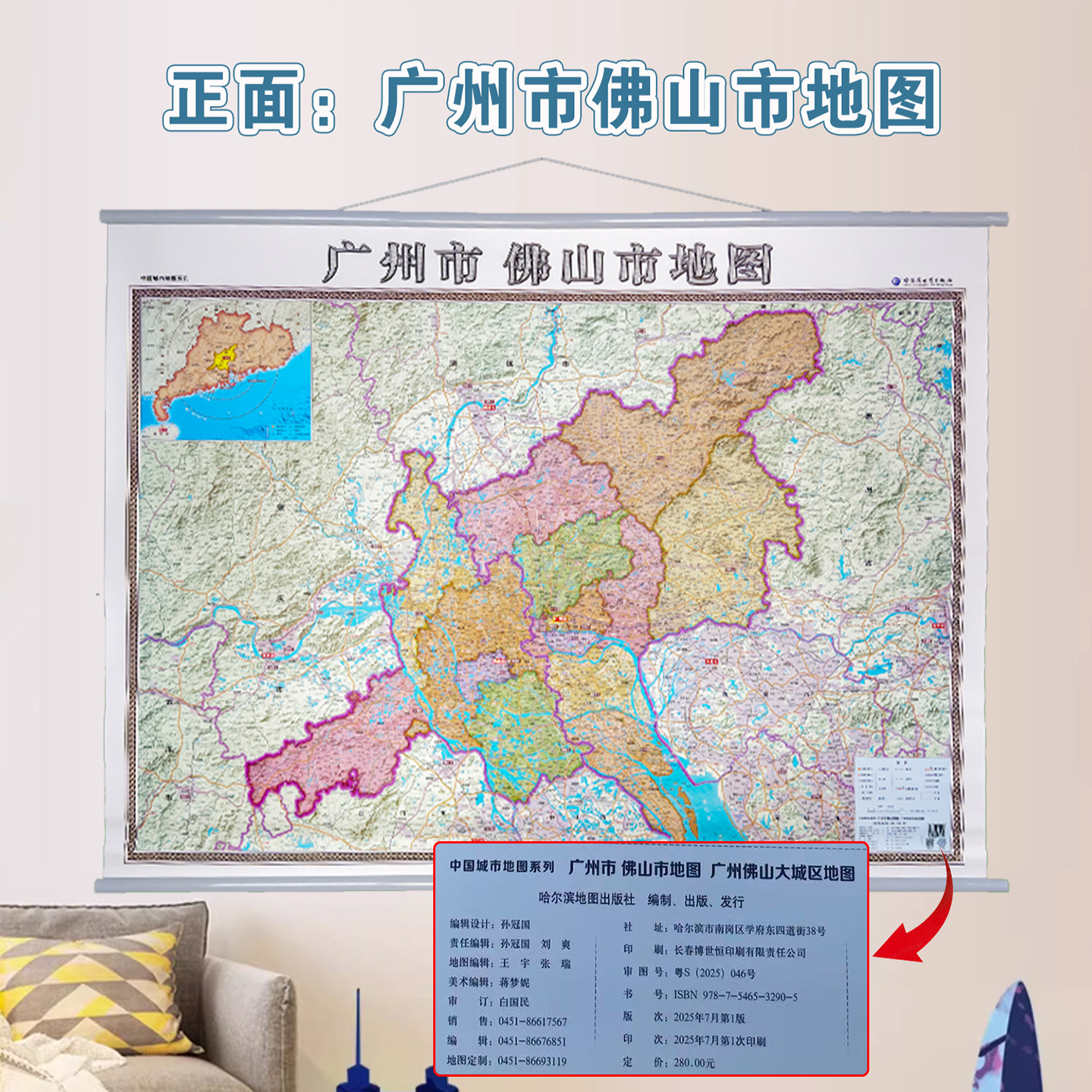 办公室家用挂墙覆膜防水1.4米x1米尺寸哈尔滨地图出版 广州佛山大城区地图双面地图挂图全新改版 社 广州市佛山市地图 2025新版
