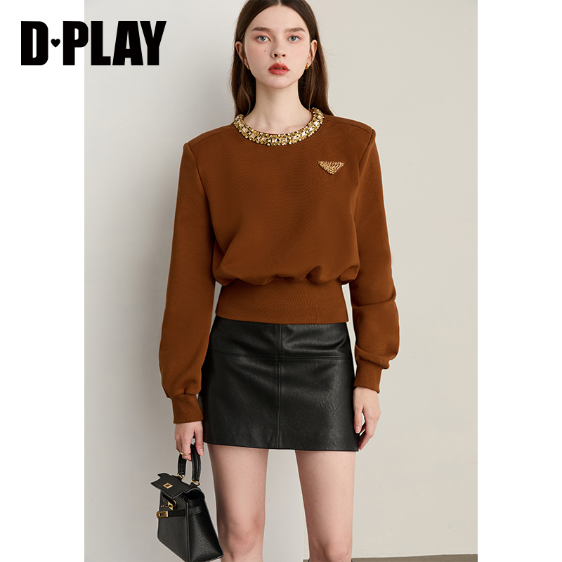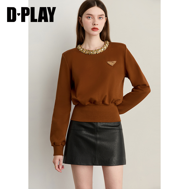 复古长袖 DPLAY2025年秋季 卫衣女时尚 褐色圆领闪钻修身 上衣 新款