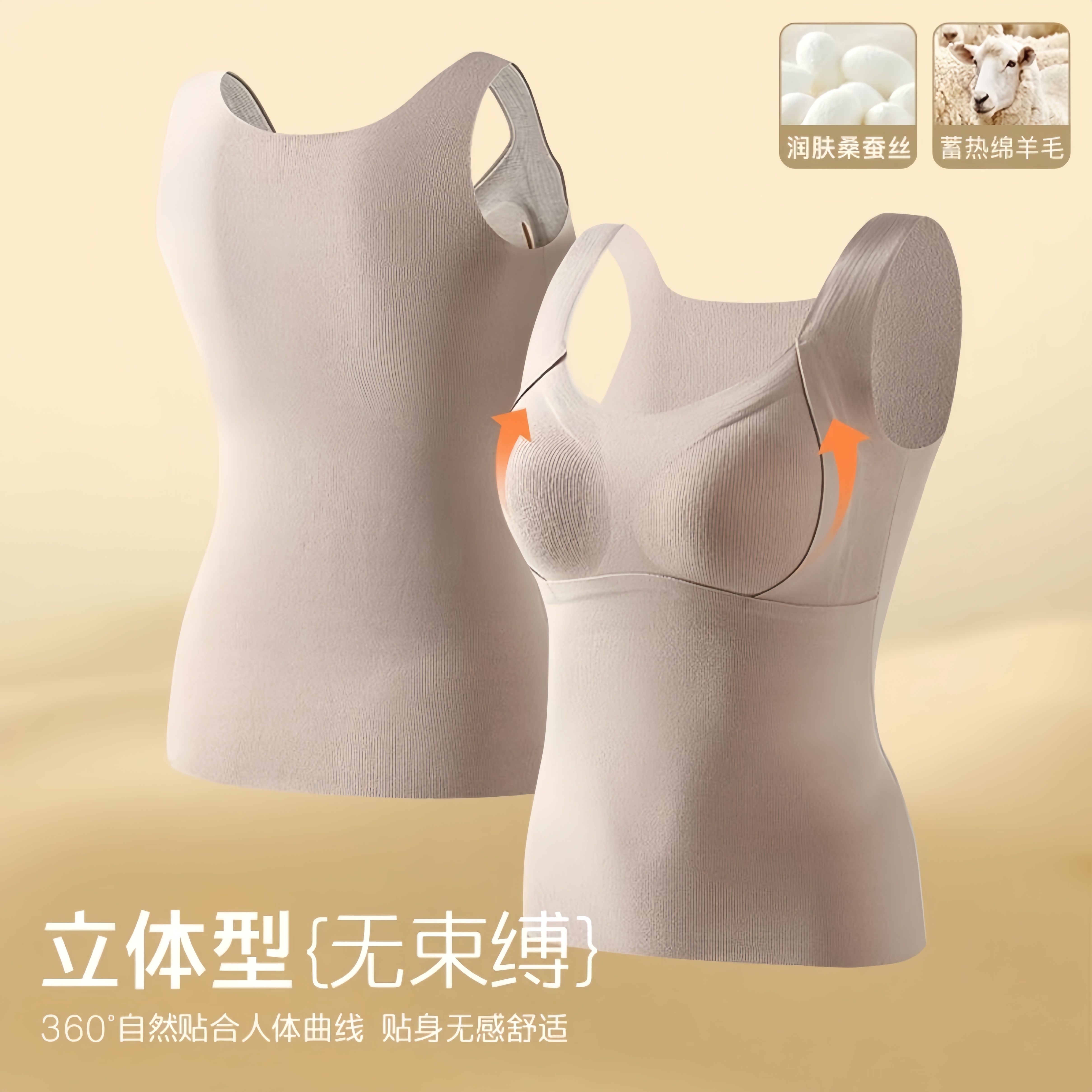 保暖背心女带胸垫蚕丝羊毛德绒秋冬季 高弹加绒无痕免穿文胸打底衫