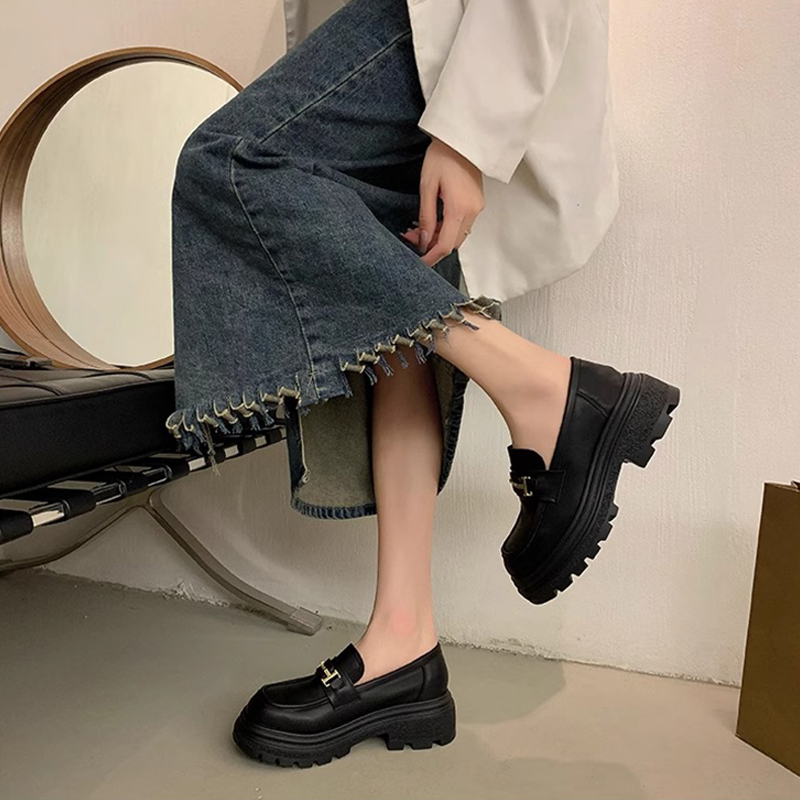 女2025新款 子英伦风小皮鞋 春秋一脚蹬单鞋 黑色鞋 增高鞋 厚底乐福鞋