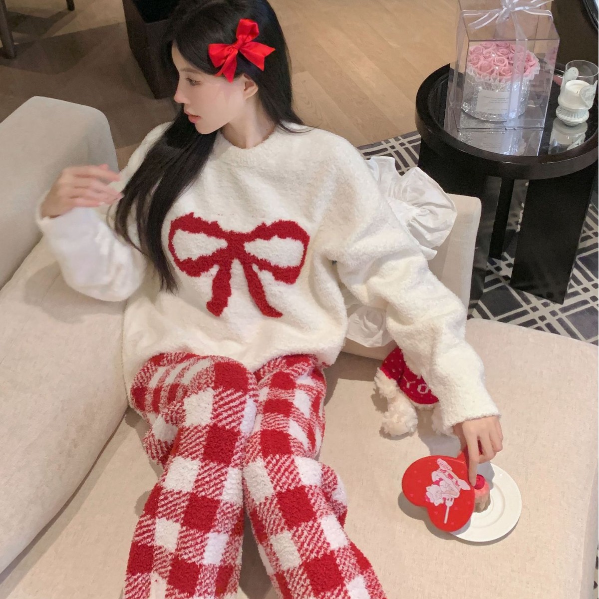 冬季 软绵绵睡衣撞色红色蝴蝶结半边绒少女加厚保暖家居服 新款