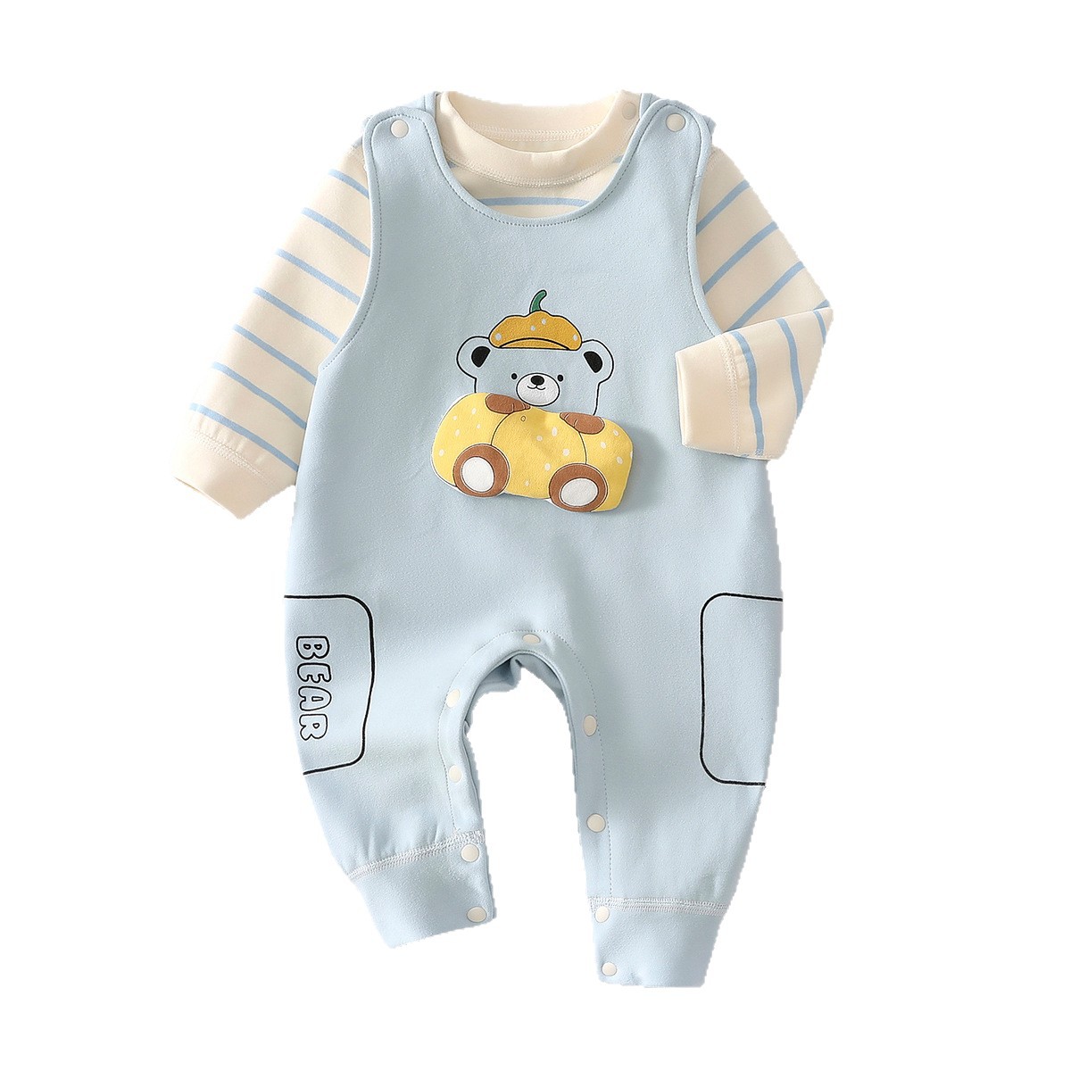 套装 婴儿条纹T恤奶芙绒背带裤 新生儿衣服超萌 款 男宝宝连体衣秋季