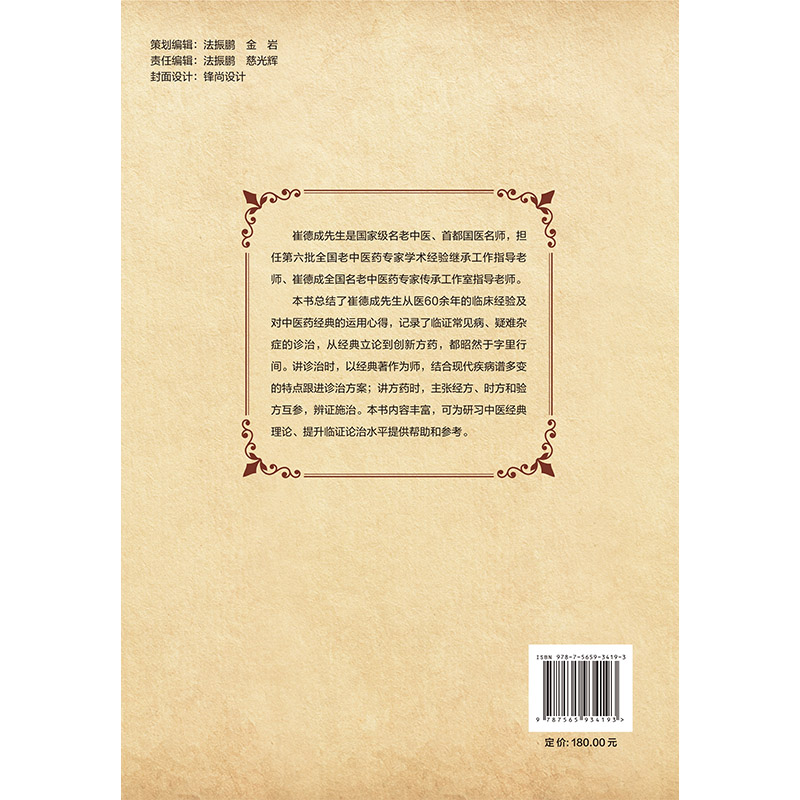 王继东 主编 北京大学医学出版 崔德成 社 运用心得 崔丽平 临床经验及对中医药经典 临证体悟 本书总结了崔德成先生从医60余年