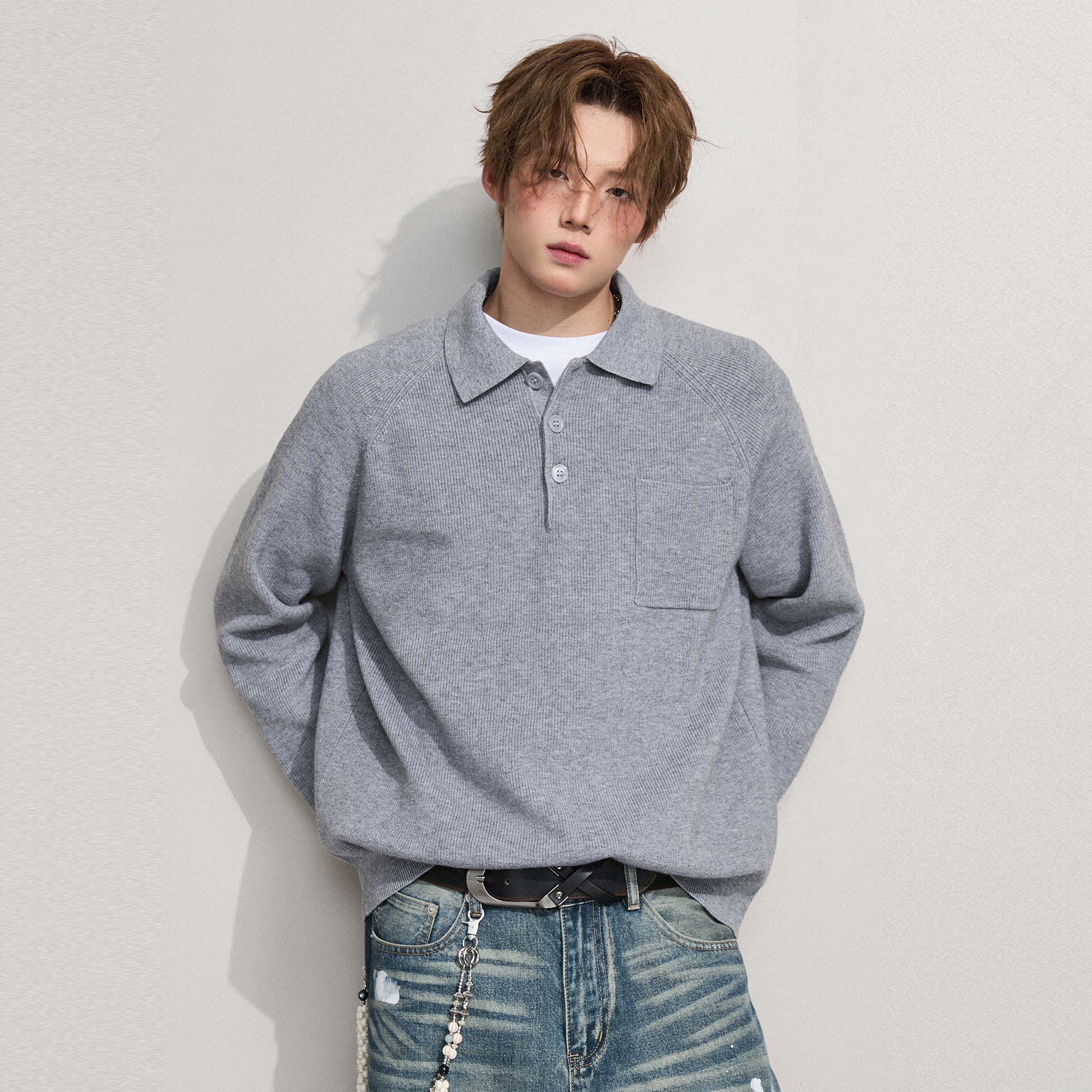 蓝色翻领毛衣 新款 阔色慵懒风灰色针织开衫 外套上衣女2025秋冬季