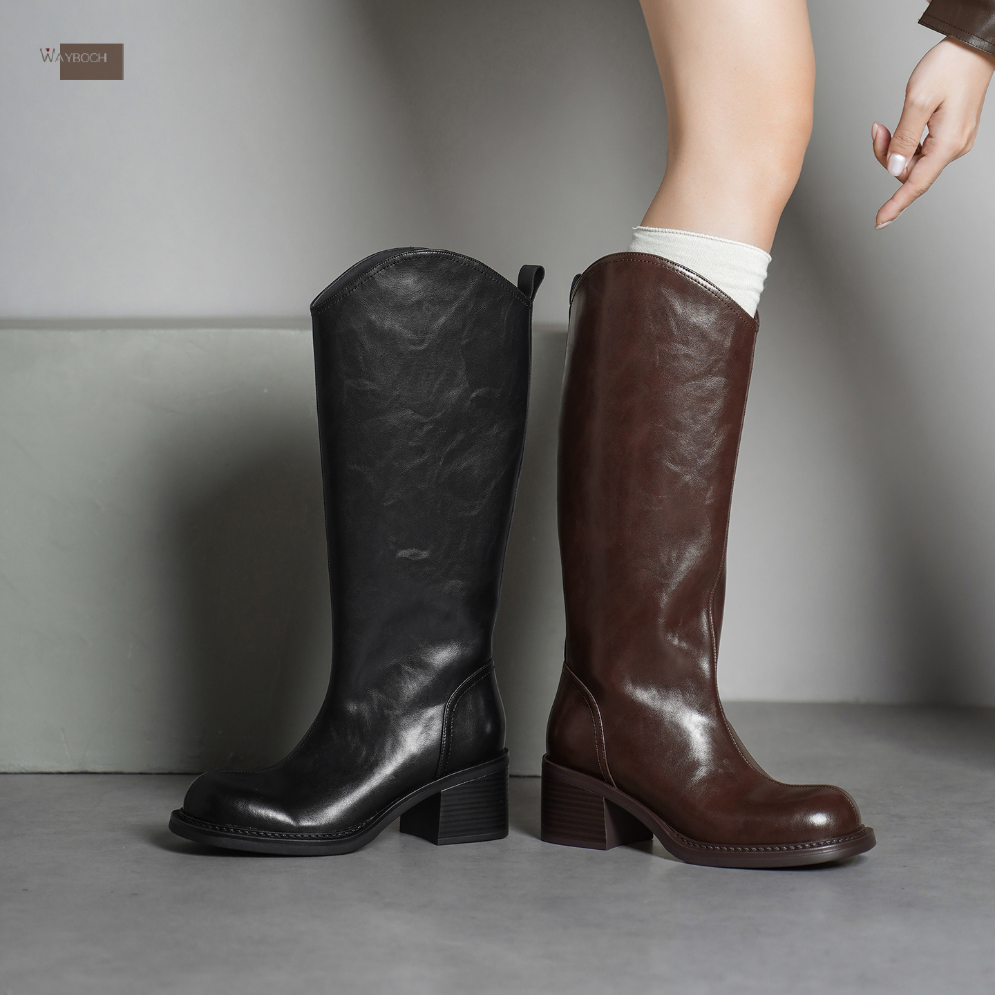 玮保 粗跟圆头高筒骑士靴女高跟一脚蹬宽筒靴马靴长靴不掉筒 真皮