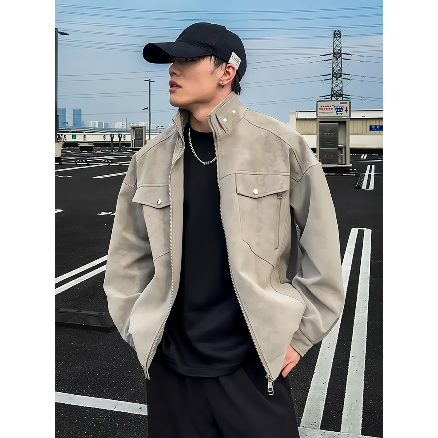 外套高级感立领机车服 潮牌痞帅哈灵顿工装 美式 扎染pu皮夹克男秋季