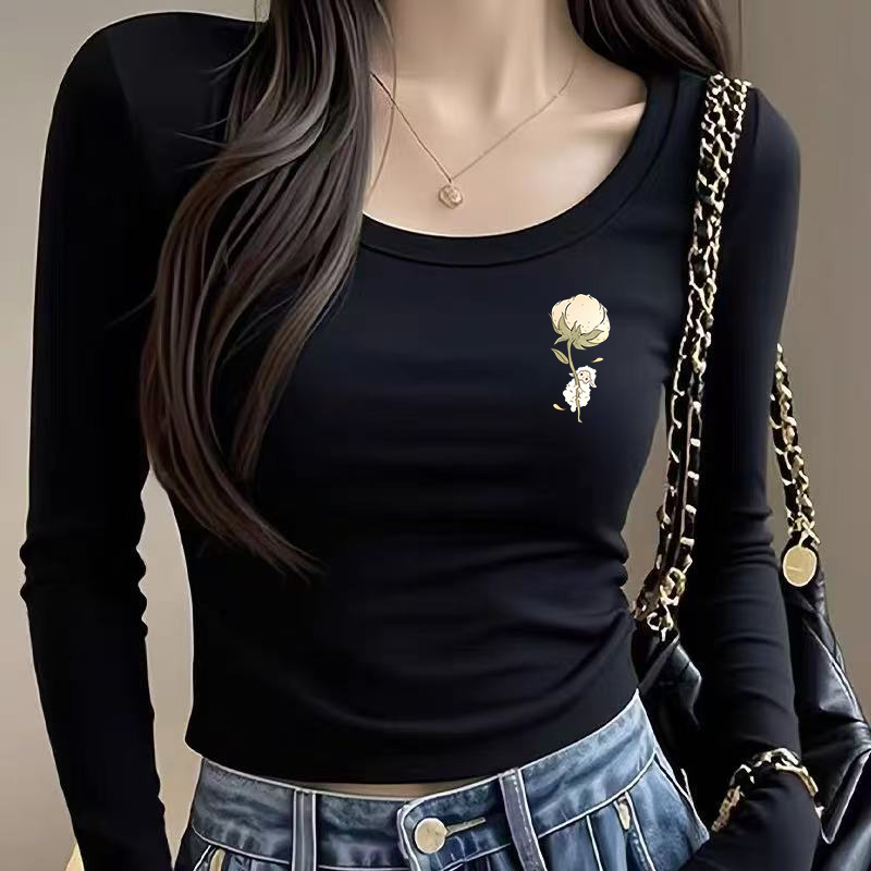 春秋修身 设计感小众U领打底衫 上衣 T恤女纯棉长袖 性感辣妹正肩短款