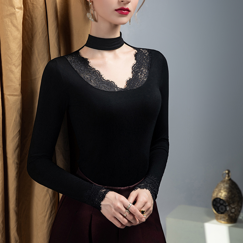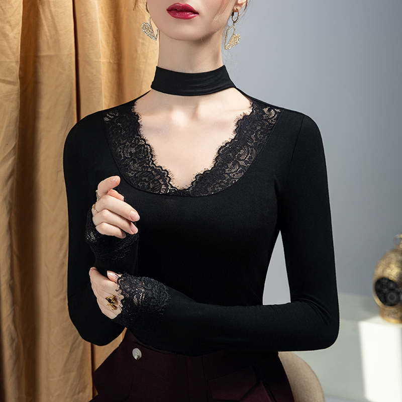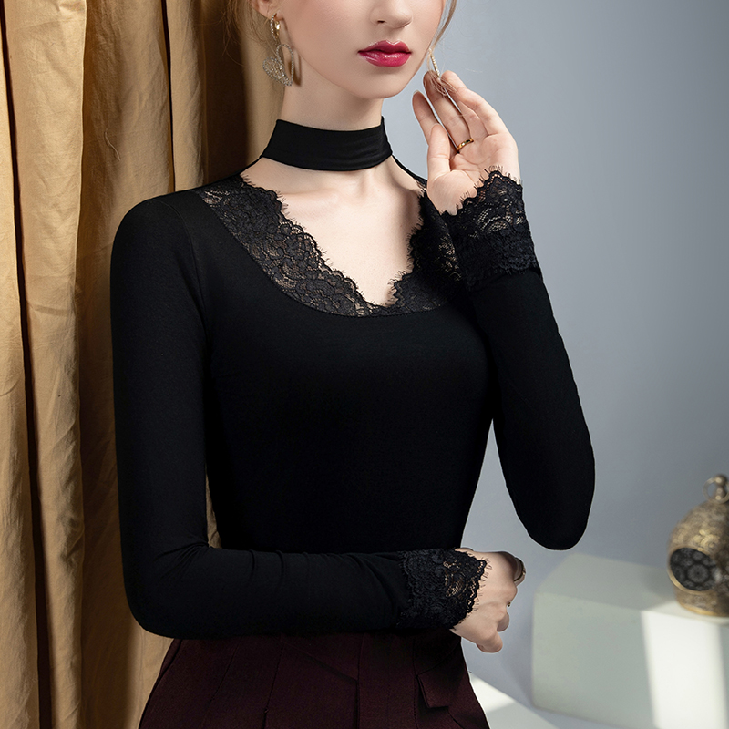 修身 挂脖领蕾丝花边拼接打底衫 内搭洋气小衫 新款 上衣 女2025秋季