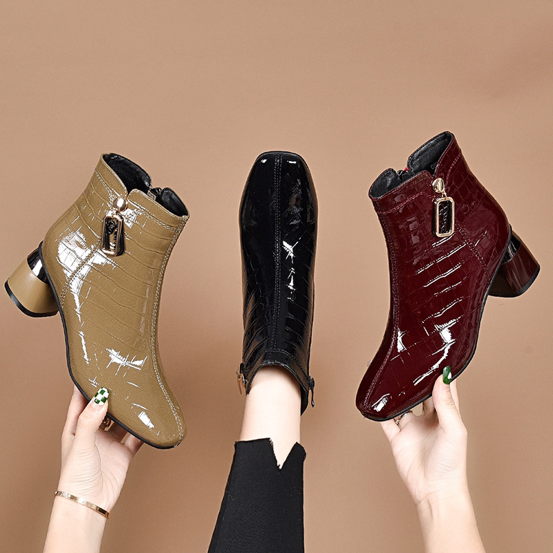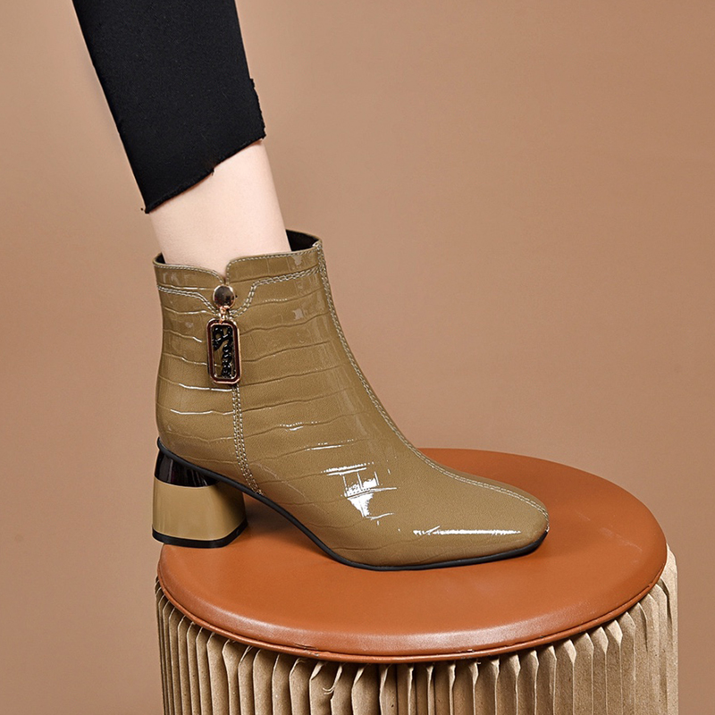 软皮粗跟气质靴子秋冬新款 配大衣短靴漆皮 方头加绒高跟软皮爆款