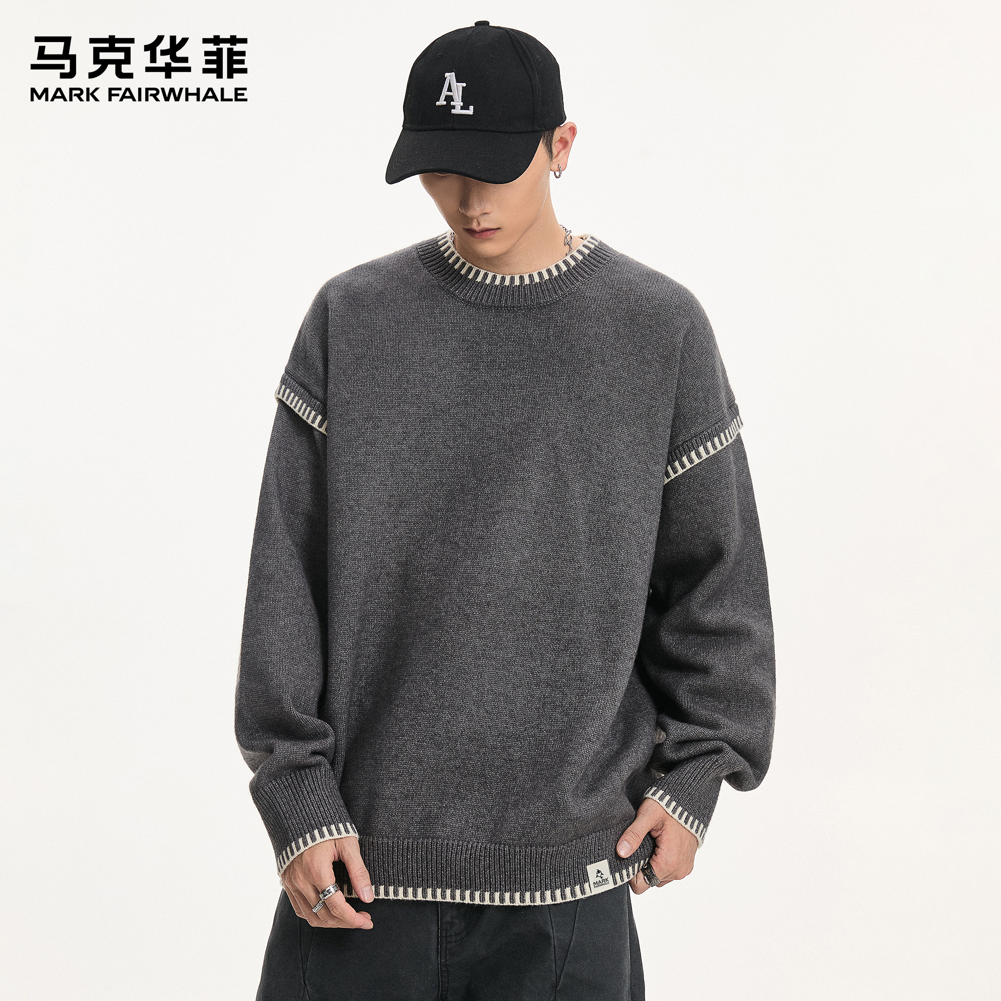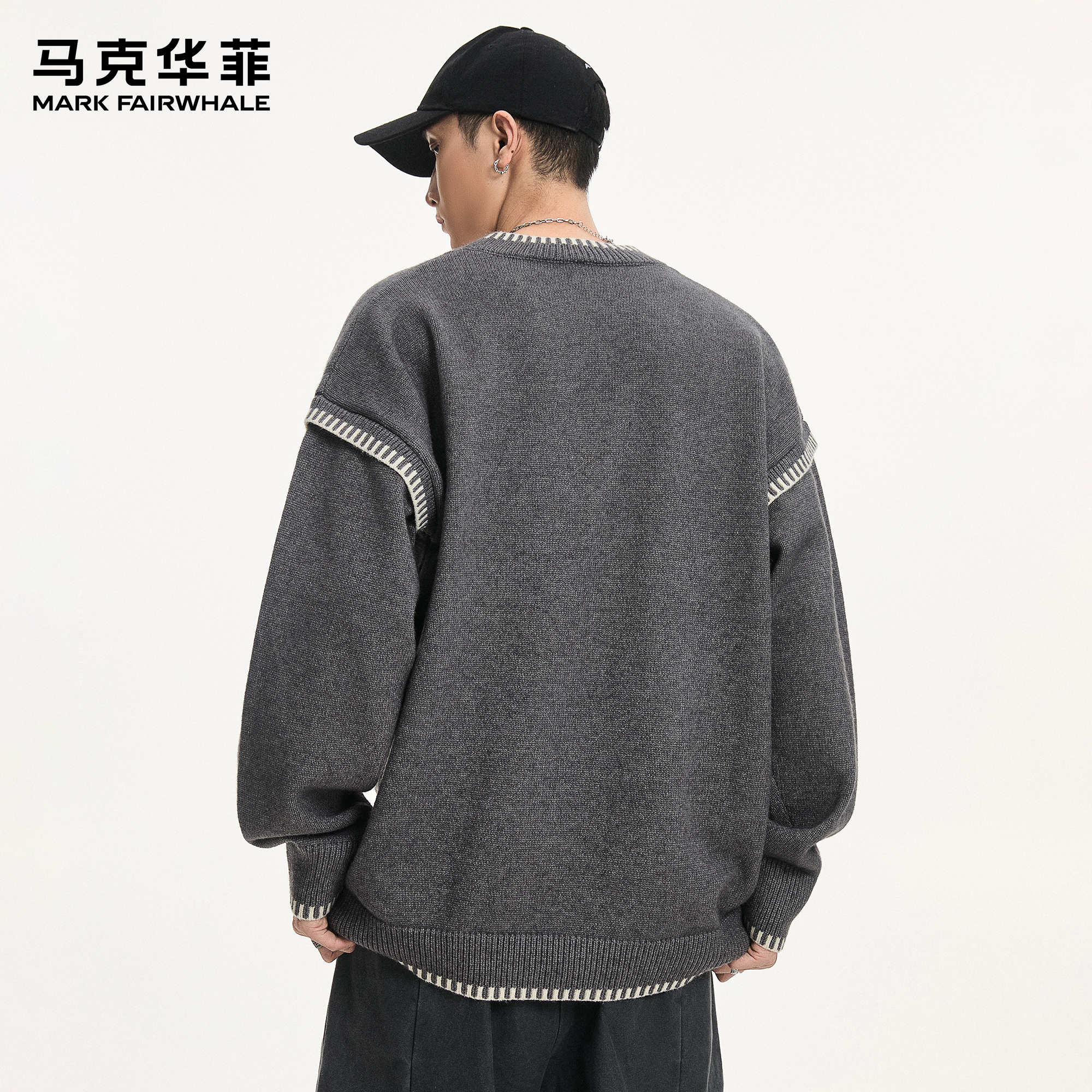 LAMLICKA蓝色小狗圆领套头毛衣男秋季 上衣 宽松慵懒风设计感针织衫