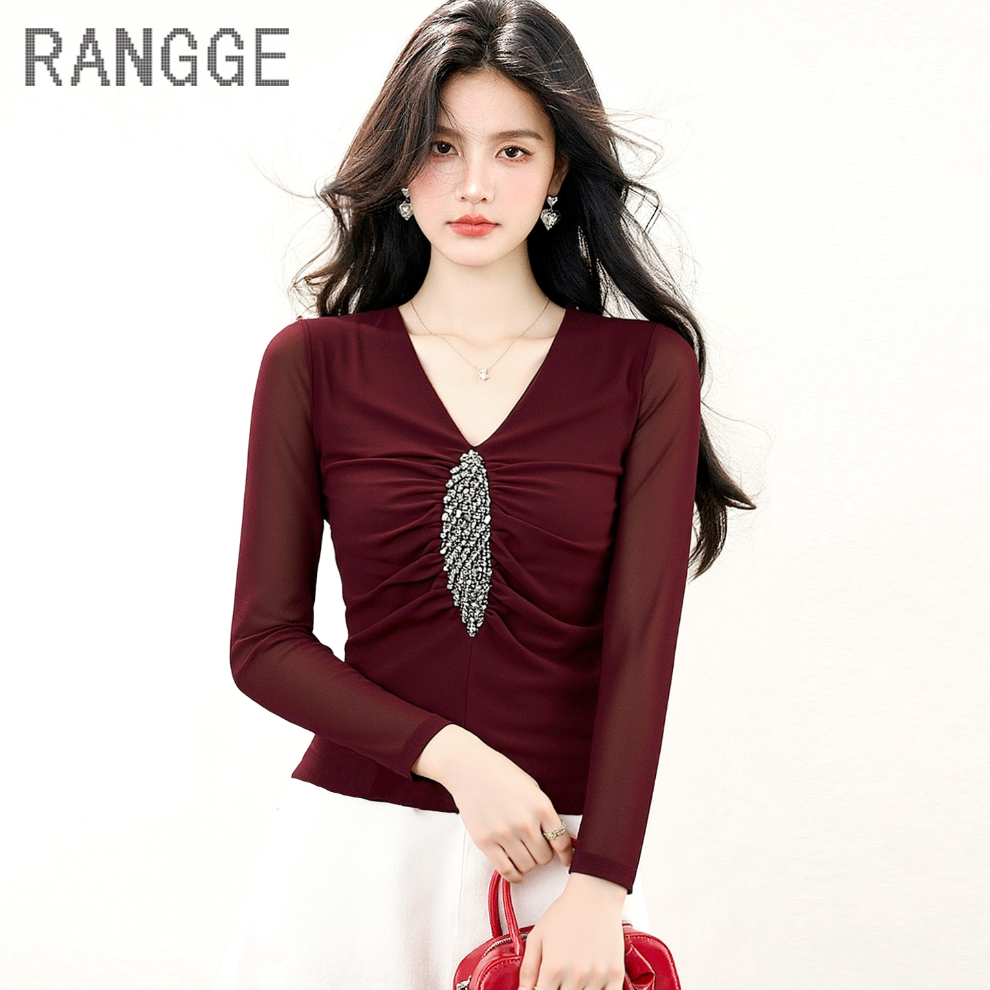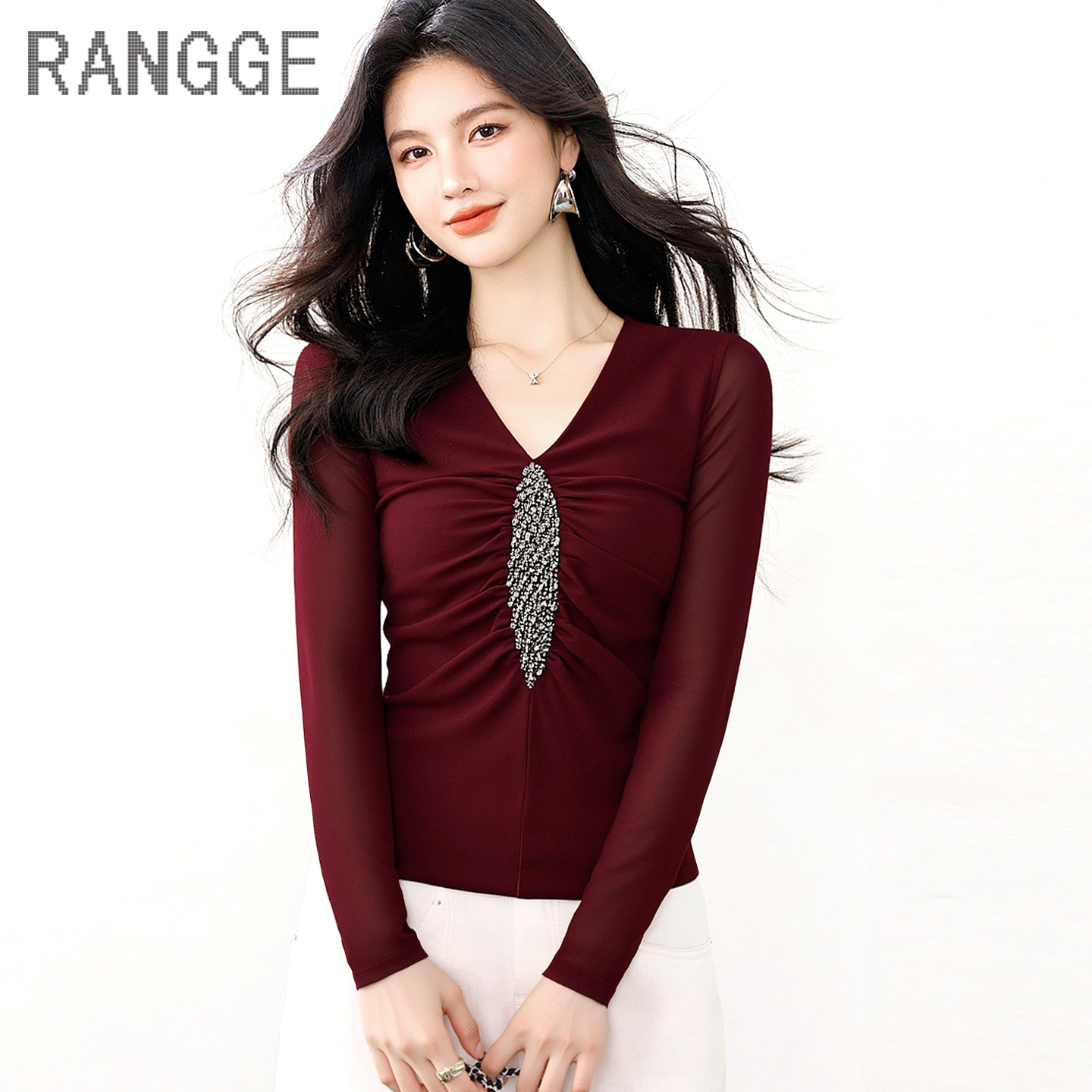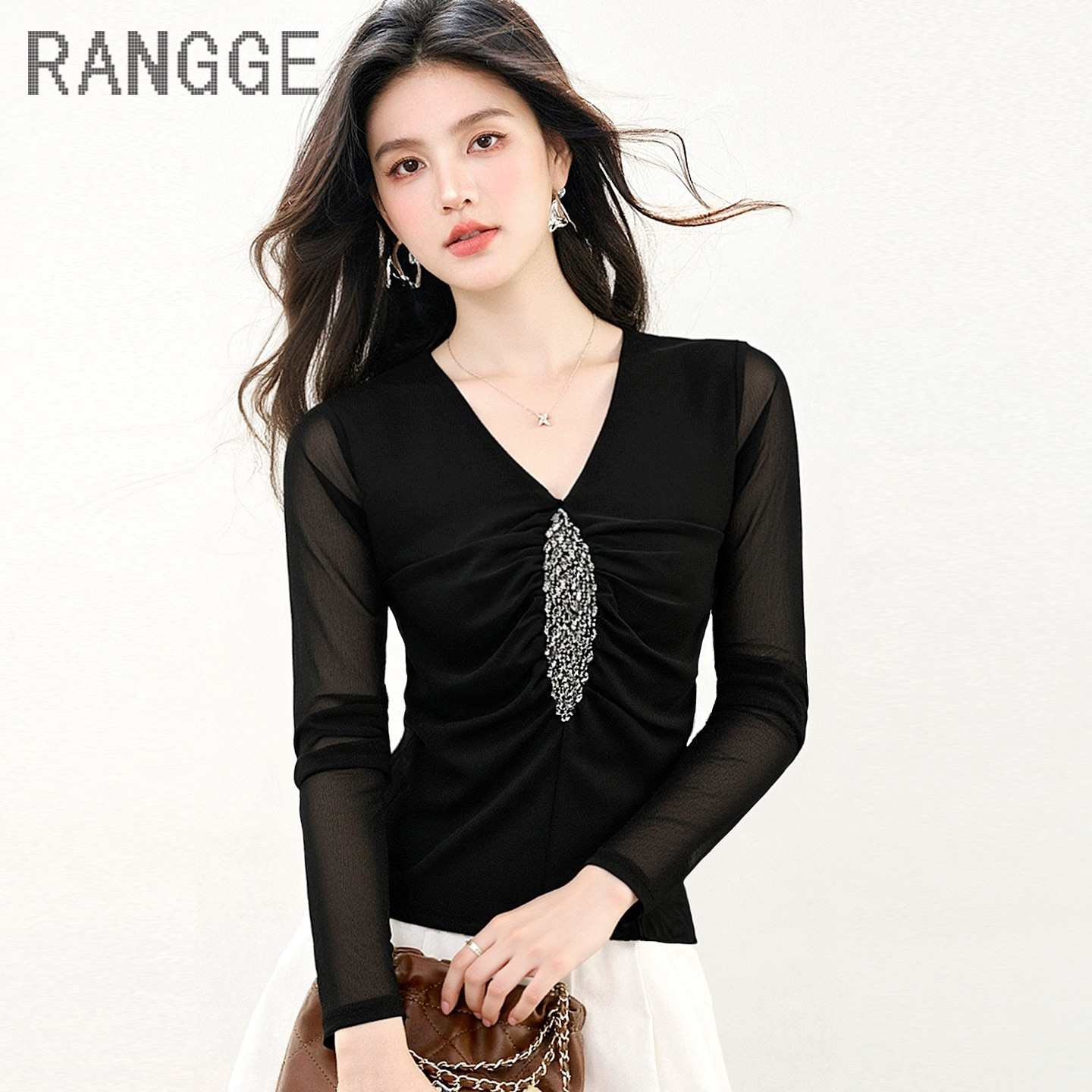 弹力女V领镶钻蕾丝上衣秋季 薄款 长袖 高端独特漂亮网纱别致打底衫