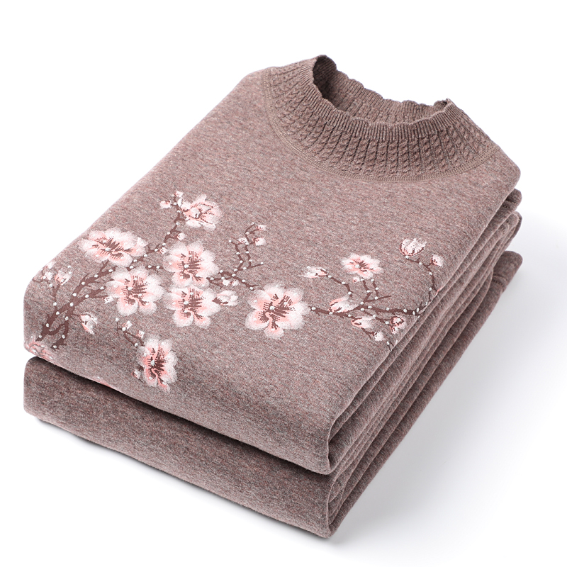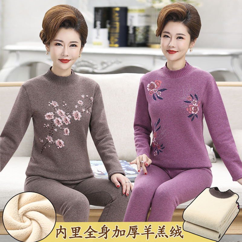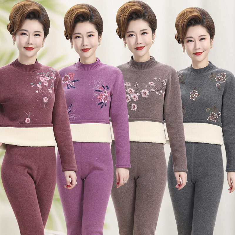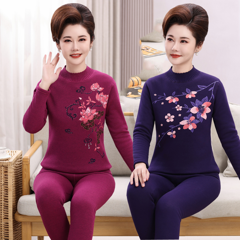 防寒保 冬季 恒源祥中老年人发热衣女加厚加绒套装 妈妈半高领加大码