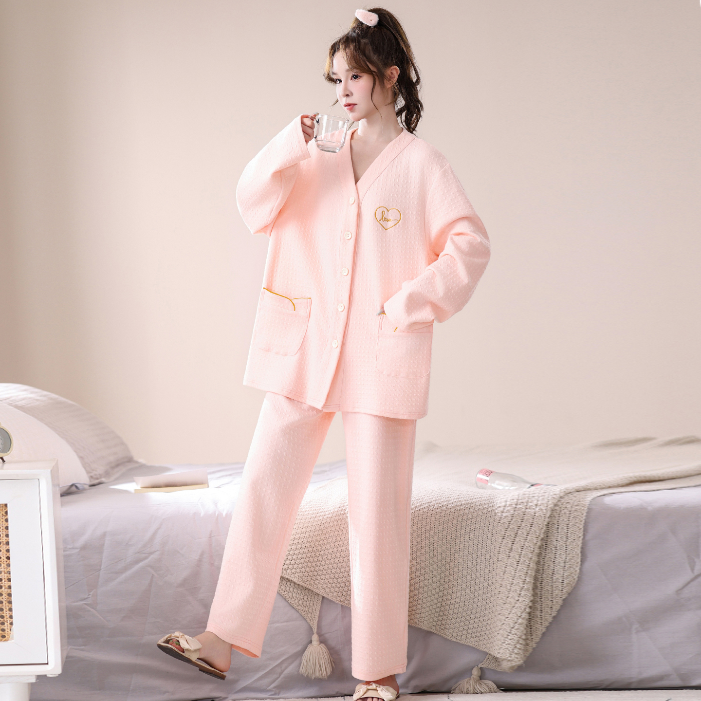 秋季 大码 纯棉睡衣女200斤胖mm秋冬中等加厚全棉刺绣家居服套装
