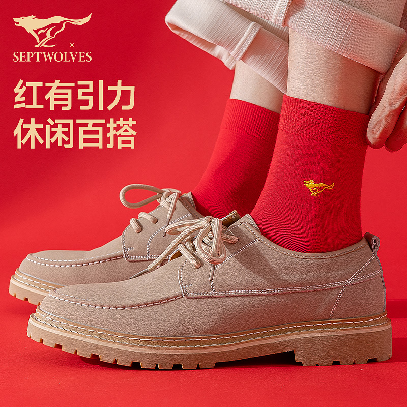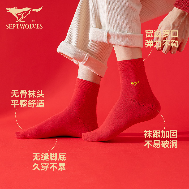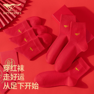 中筒袜 男士 七匹狼2025本命年新年大红袜子纯棉秋冬款 刺绣鸿运四季
