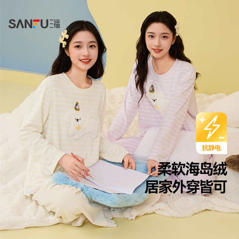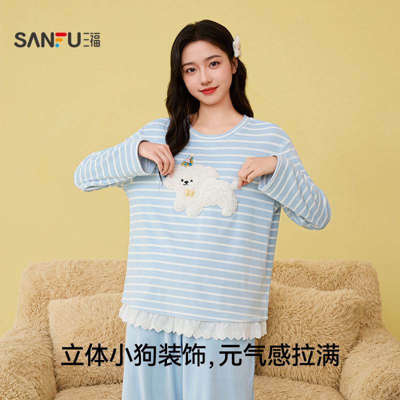 甜美花边家居服507740 立体狗海岛绒抗静电睡衣套装 三福女冬季