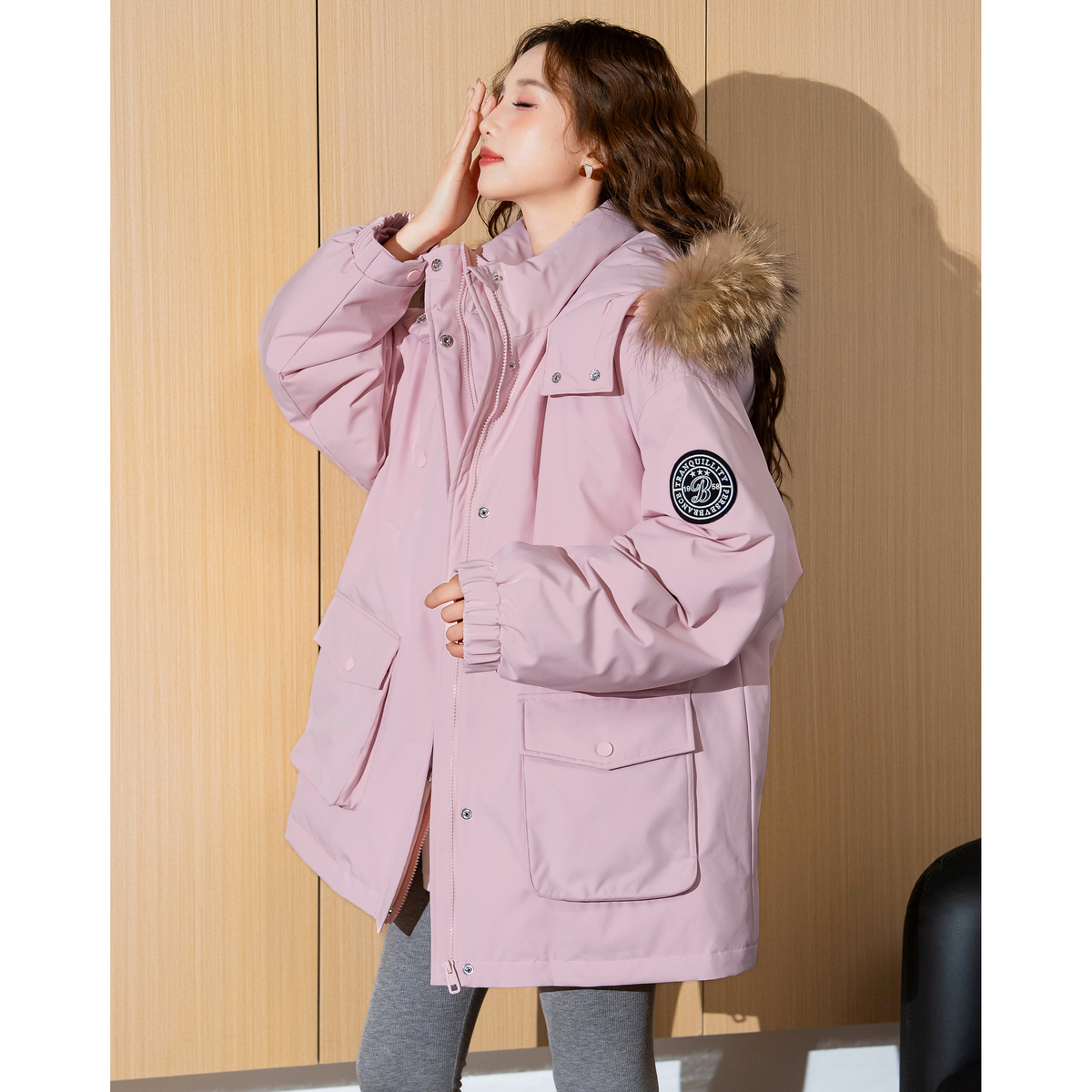 新款 羽绒服女冬季 唐狮粉色工装 户外保暖连帽羽绒外套tu 防水