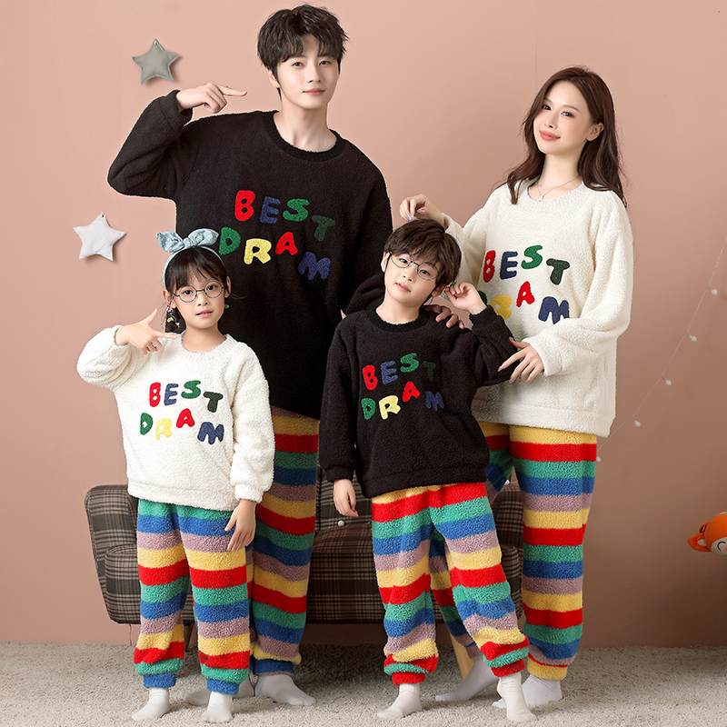 法兰绒套装 半边绒亲子睡衣冬季 一家三口圆领加绒加厚家居服母女装