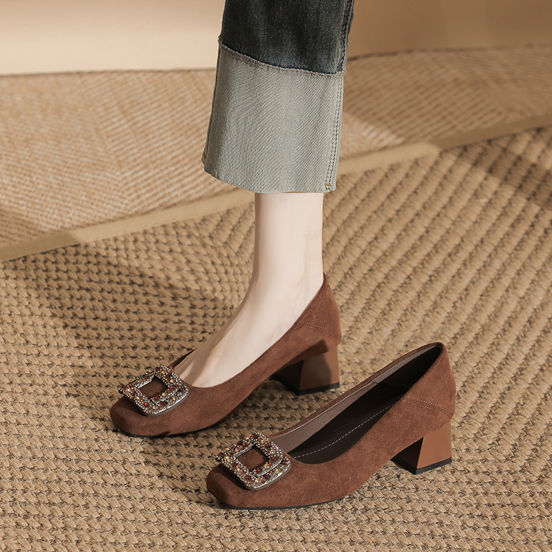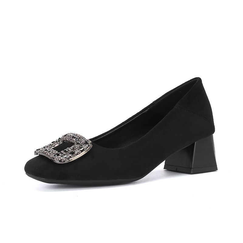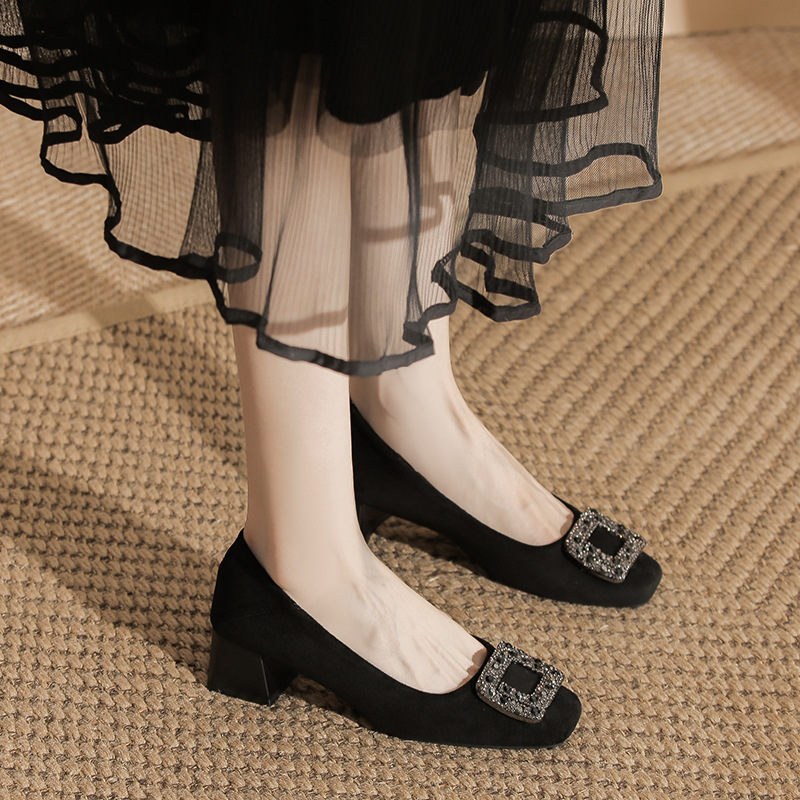 百搭粗跟浅口通勤绒面工作单鞋 新款 女2025秋季 黑色5CM职业高跟鞋