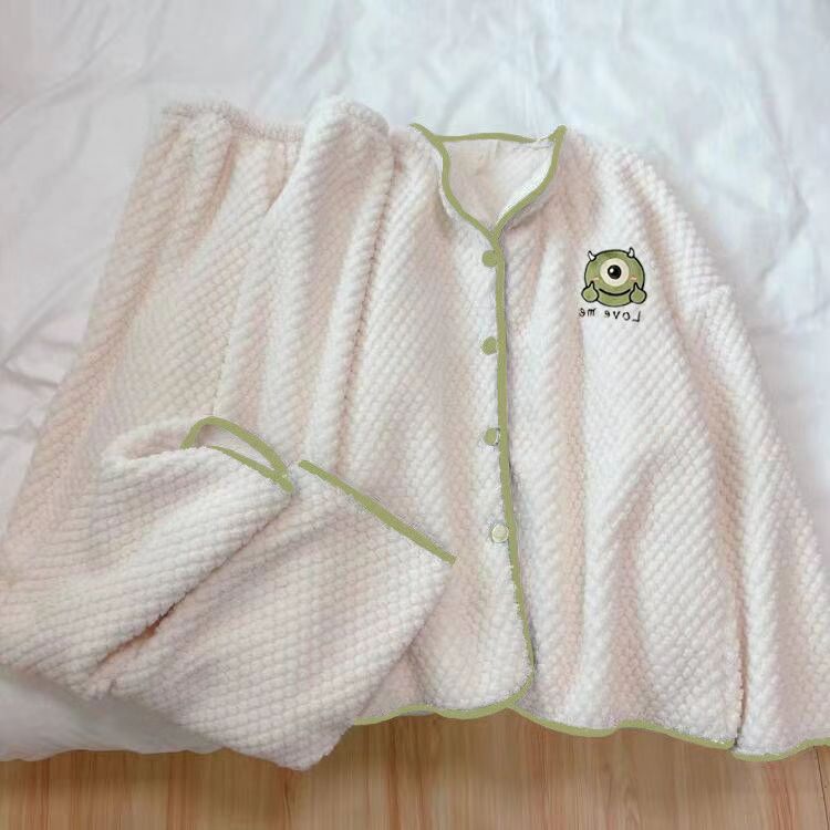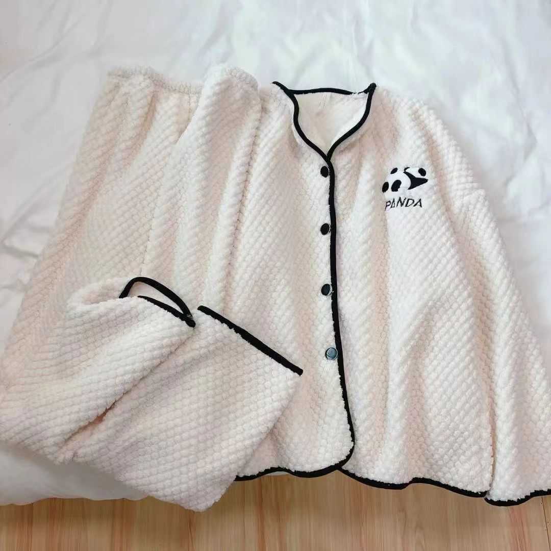 大码 春秋开衫 女士家居服 加厚珊瑚绒睡衣女冬法兰绒加绒套装 秋冬季