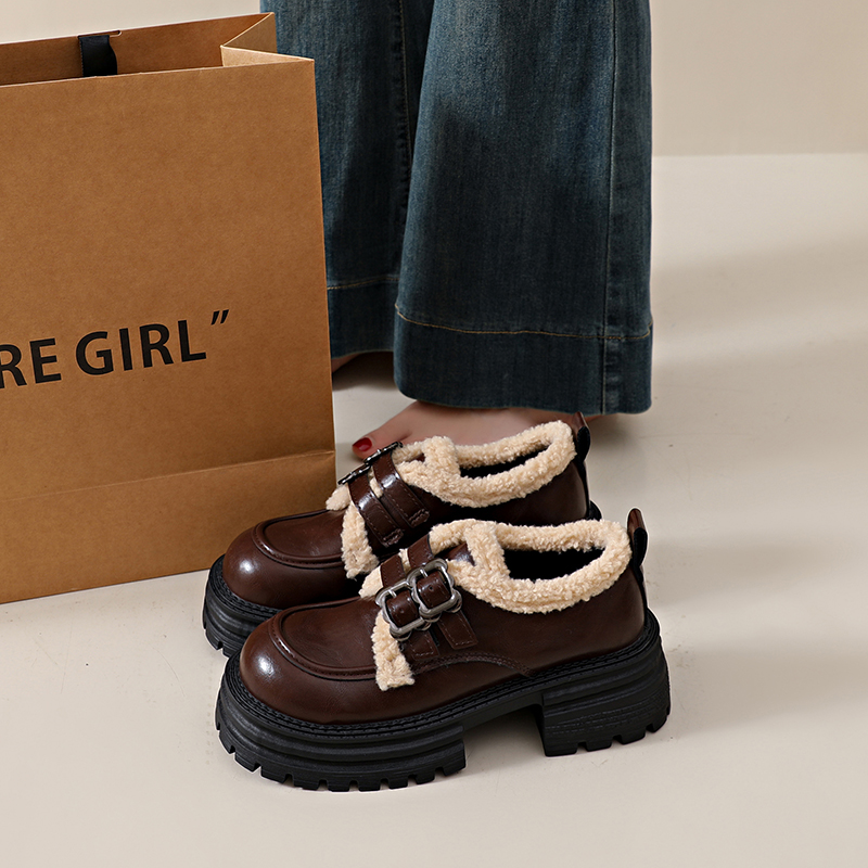 加绒乐福鞋 保暖棉鞋 女冬季 超火英伦风黑色小皮鞋 2025新款 白鹿同款
