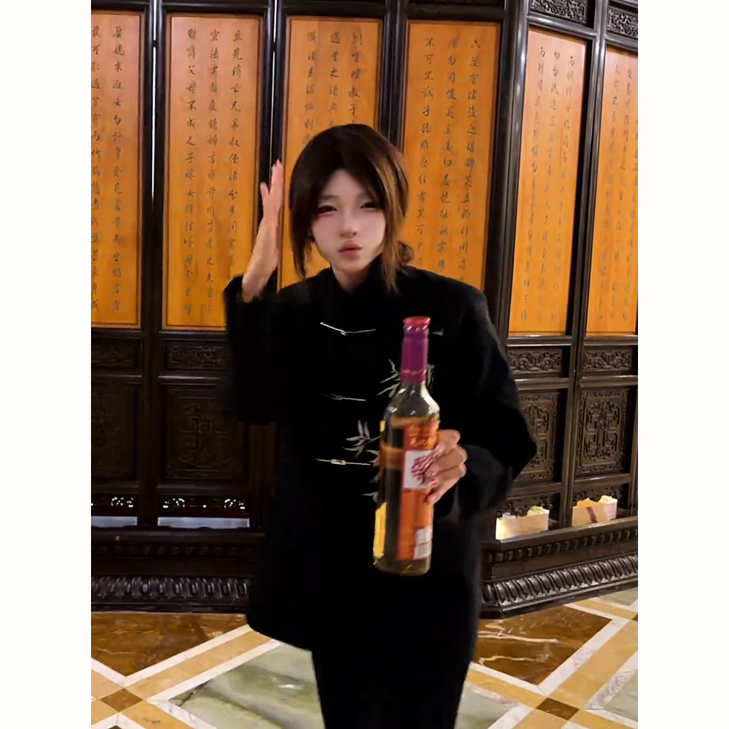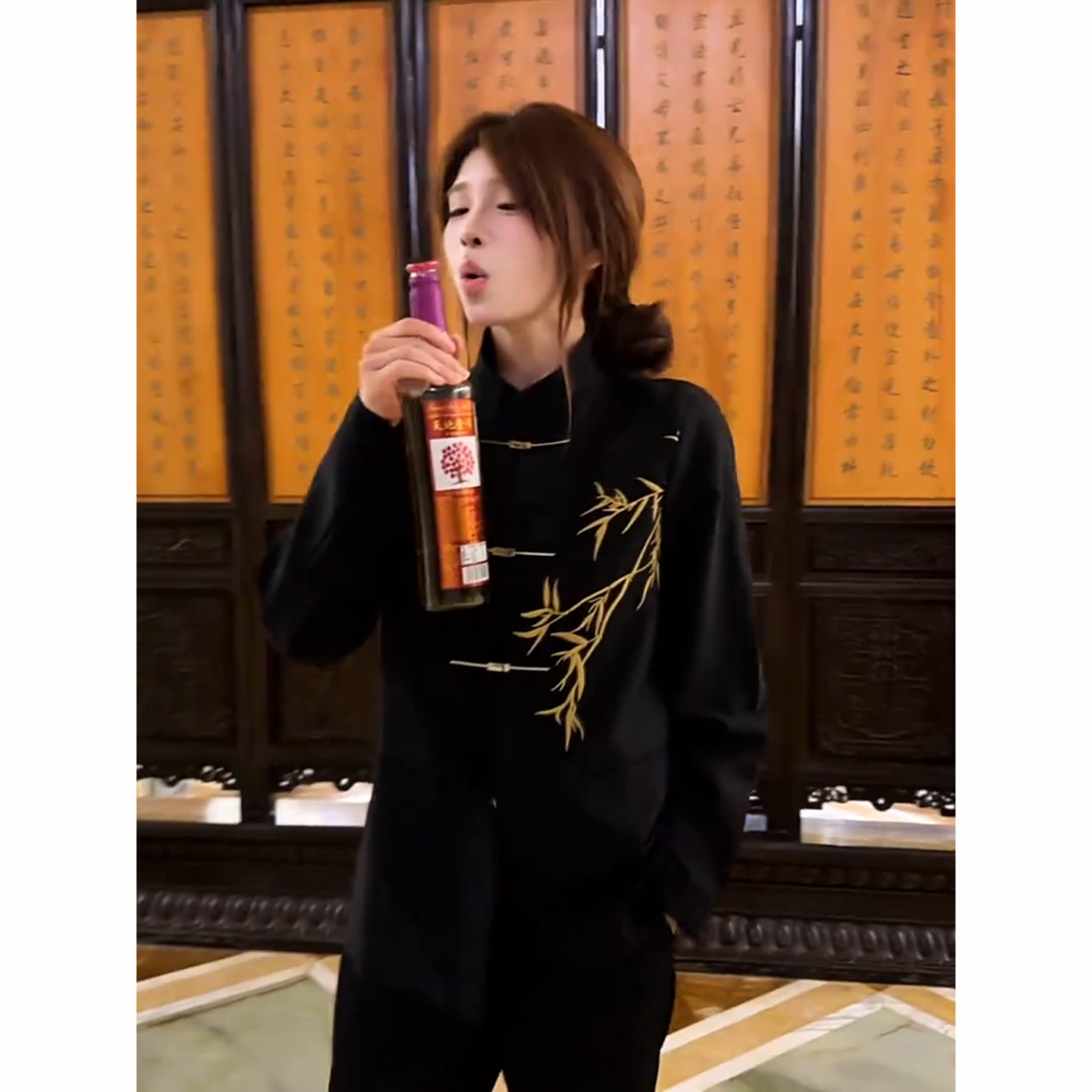 太平鸟黑金西装 外套女新挺阔外套 戗脖领廓形双排扣通勤黑色西装