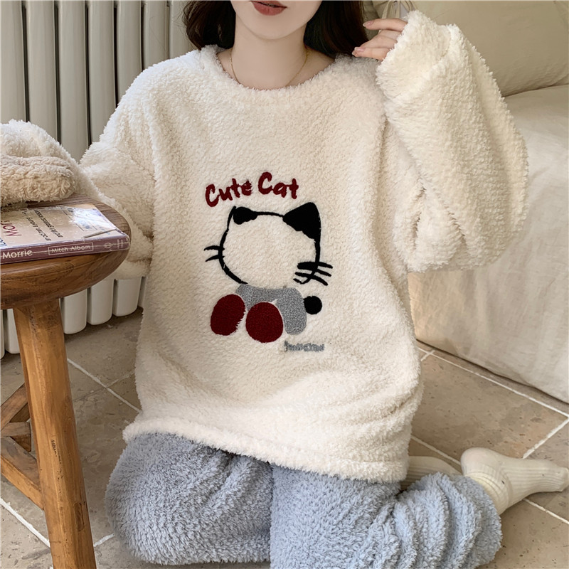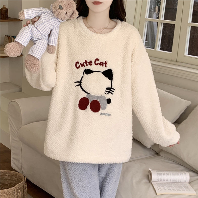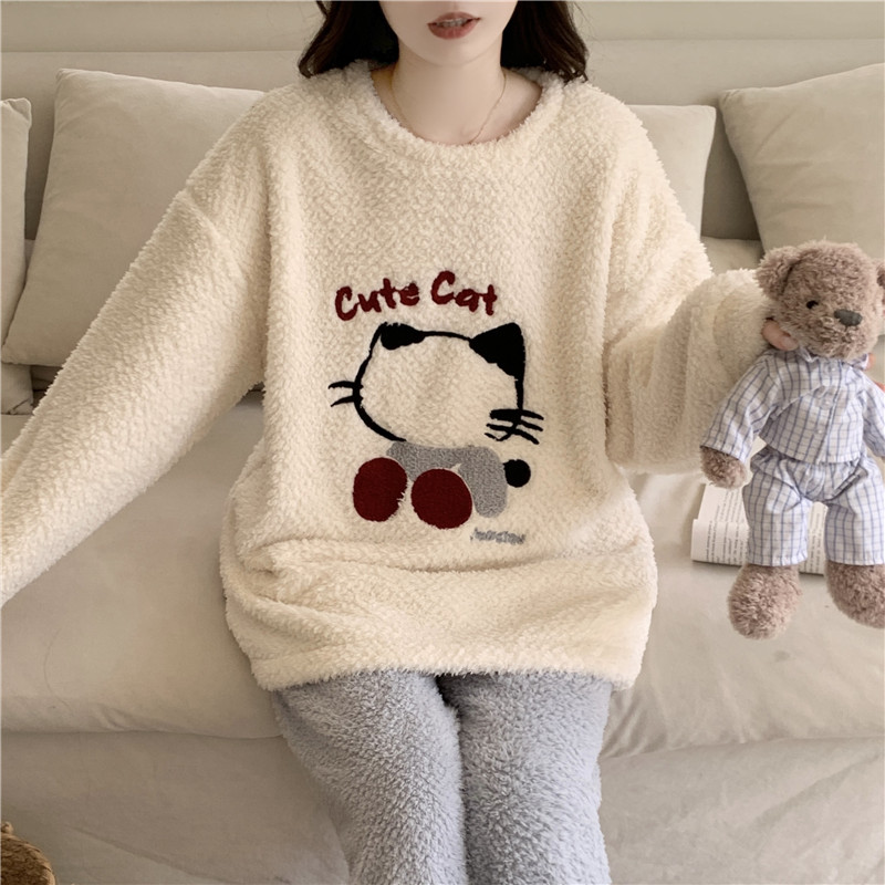 加厚款 大码 珊瑚绒睡衣女套装 开衫 家居服加绒可爱法兰绒长袖 秋冬季