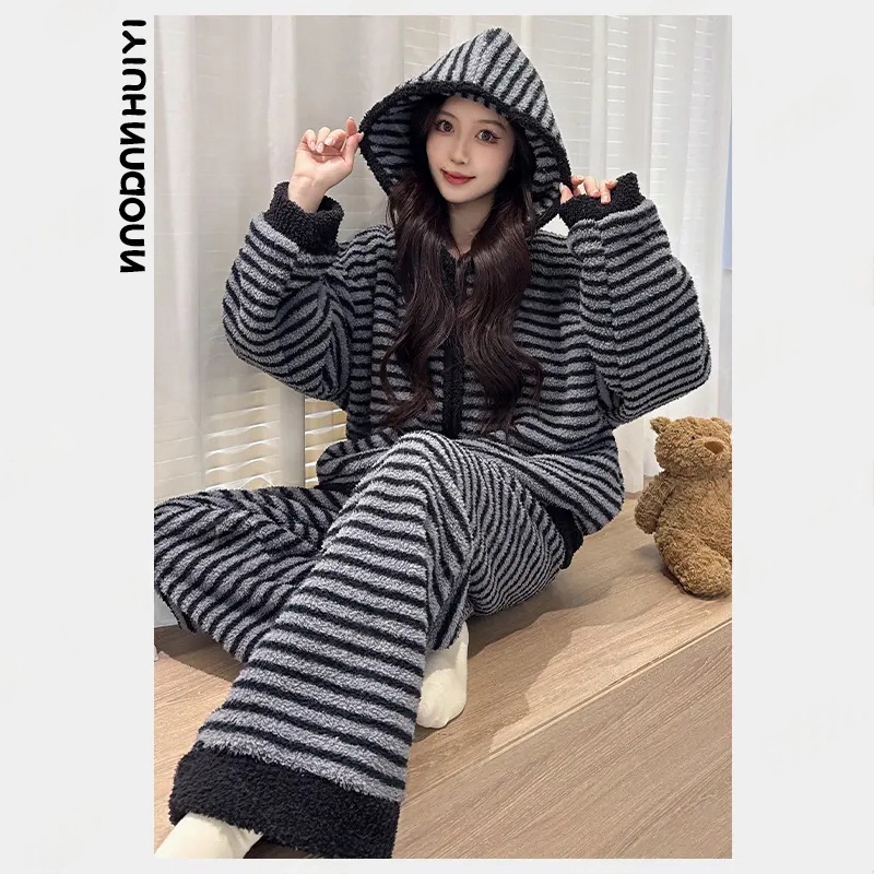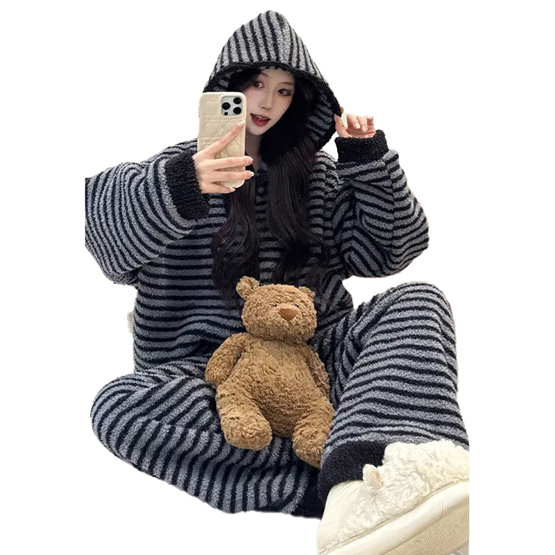 大码 春秋开衫 女士家居服 加厚珊瑚绒睡衣女冬法兰绒加绒套装 秋冬季