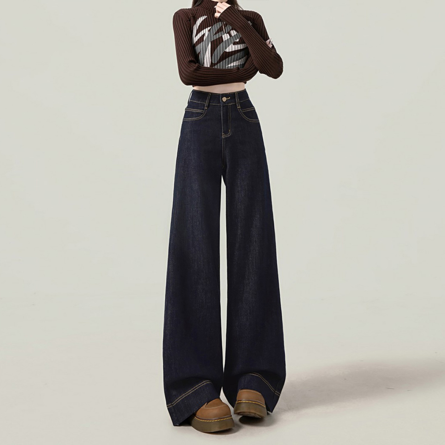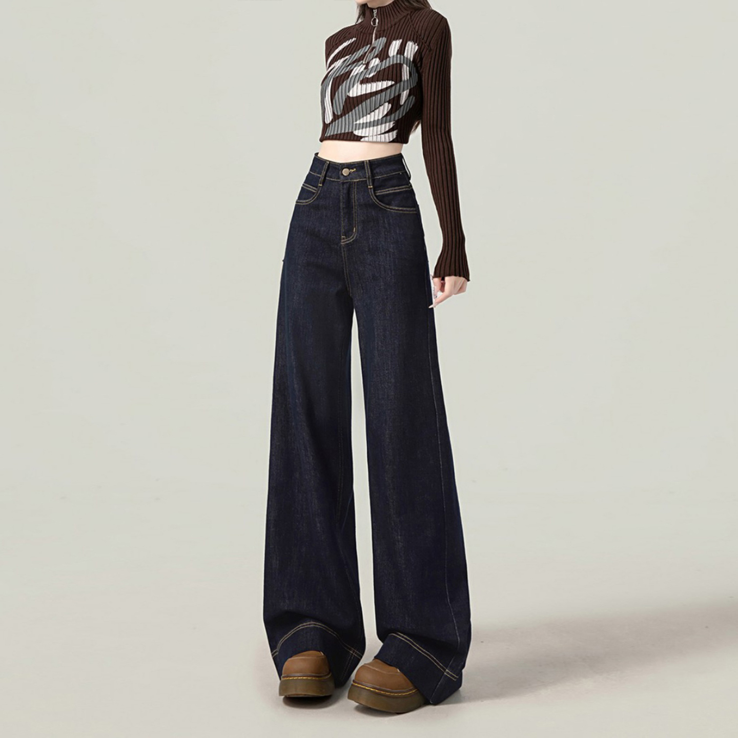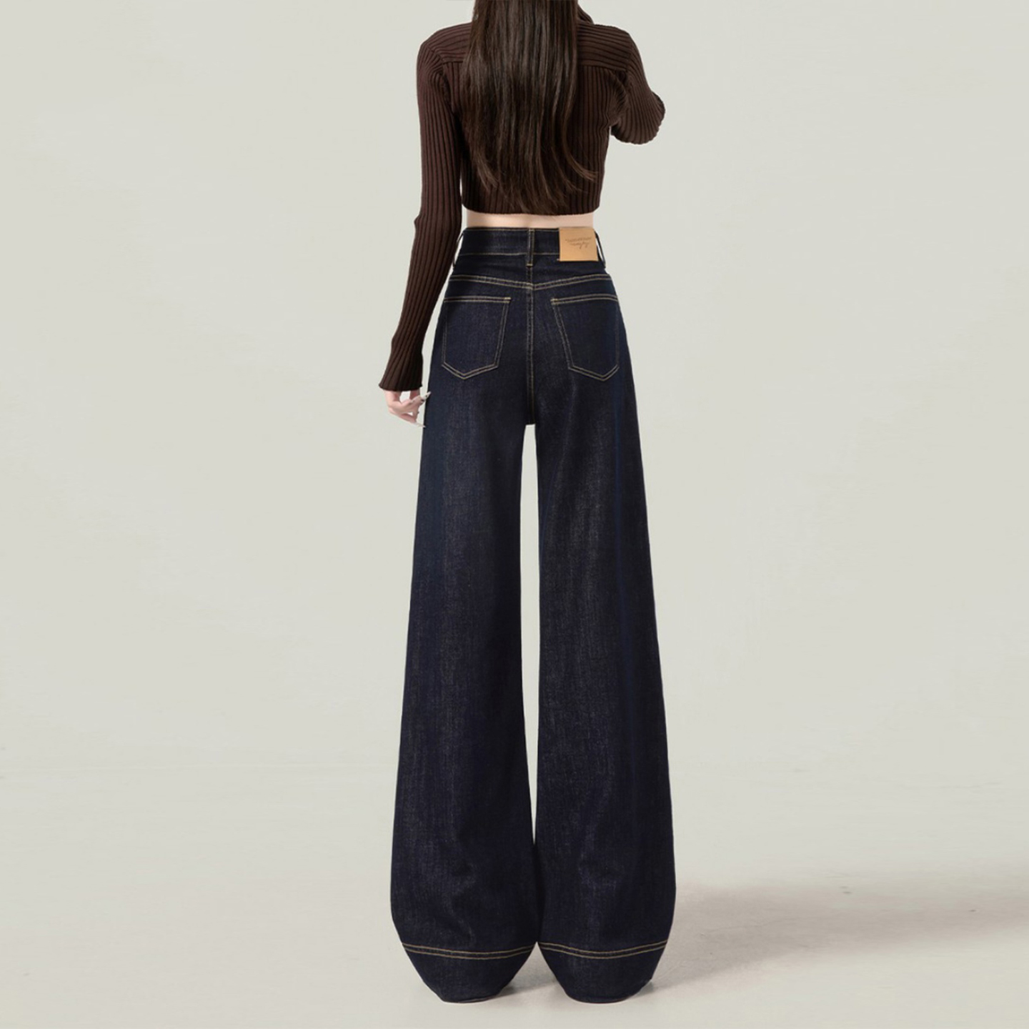 丹宁蓝小个子高腰直筒微喇裤 深蓝色阔腿牛仔裤 女秋冬加绒2025新款