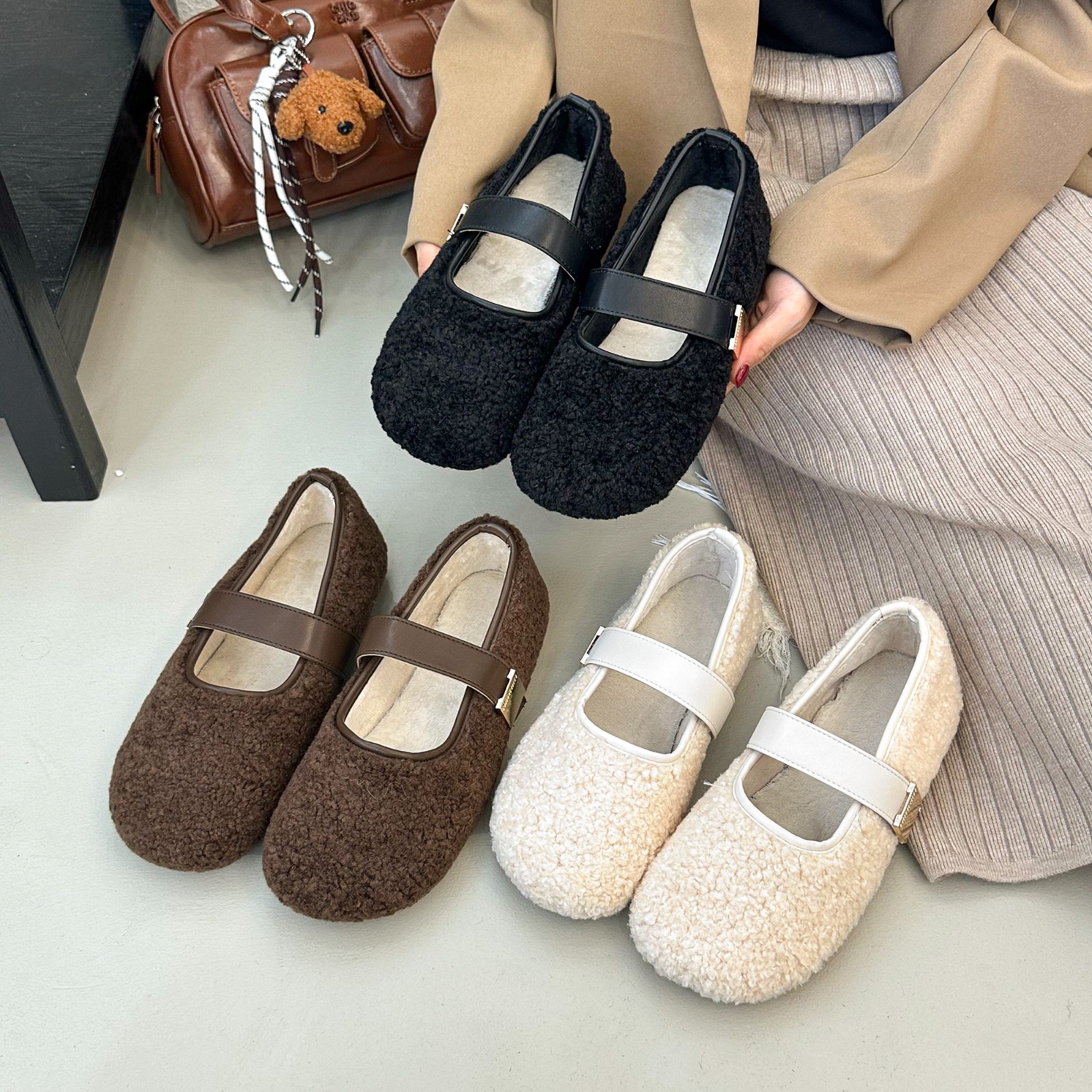 保暖加绒小众毛毛单鞋 复古方头平底一字扣带玛丽珍鞋 女2025年新款