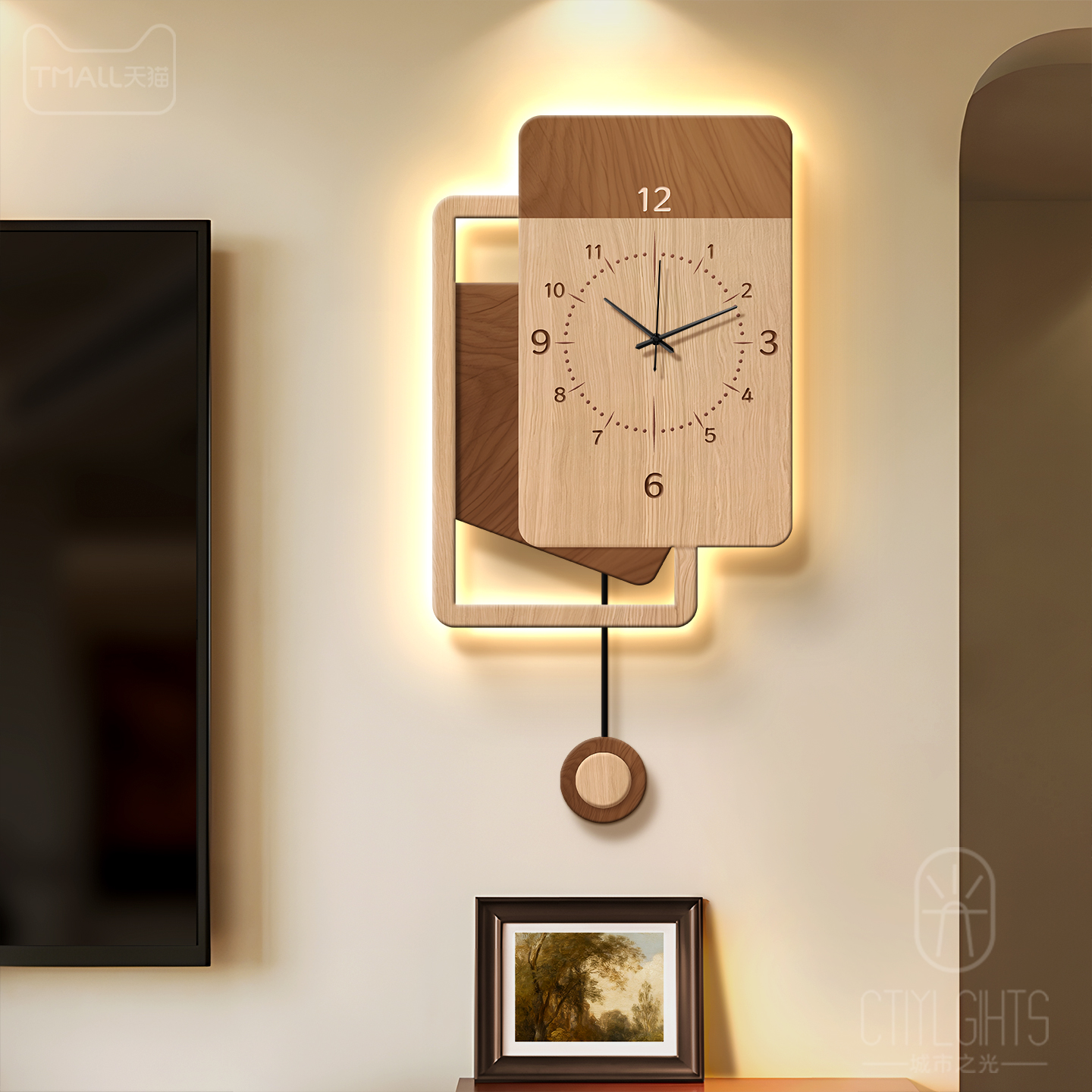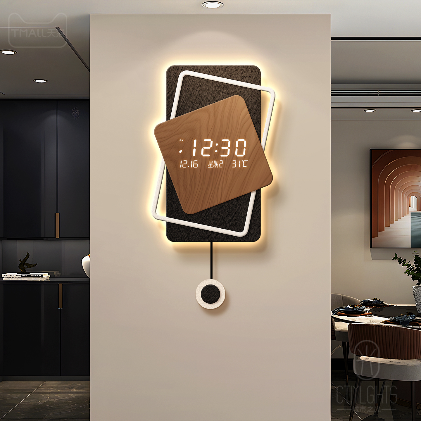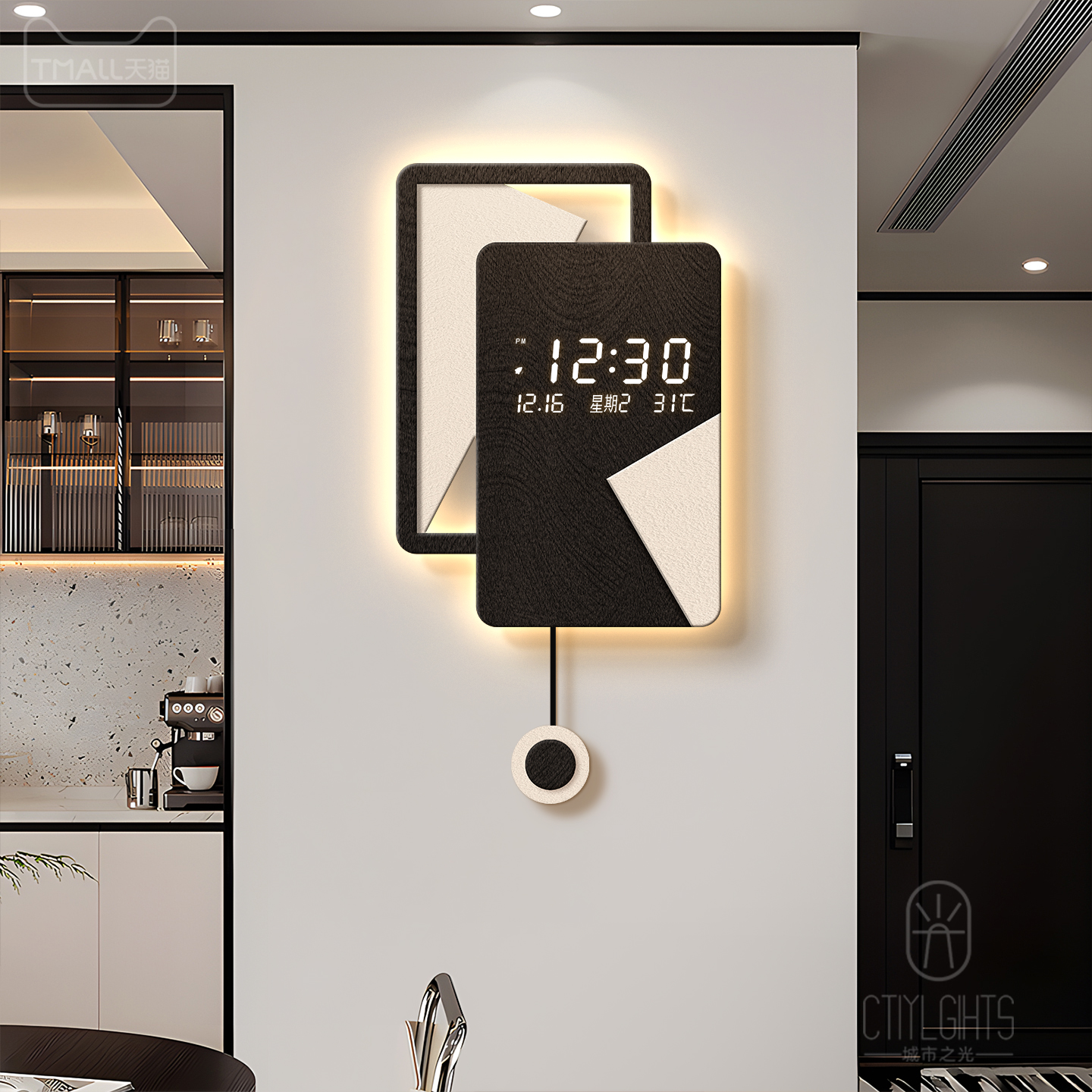 2025新款 中古风客厅钟表高级感万年历电子时钟创意发光背景墙挂钟