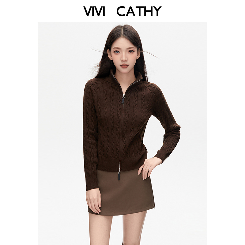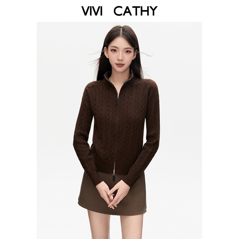 立领毛衣开衫 短款 女复古麻花针织外套 修身 VIVICATHY2025秋冬法式