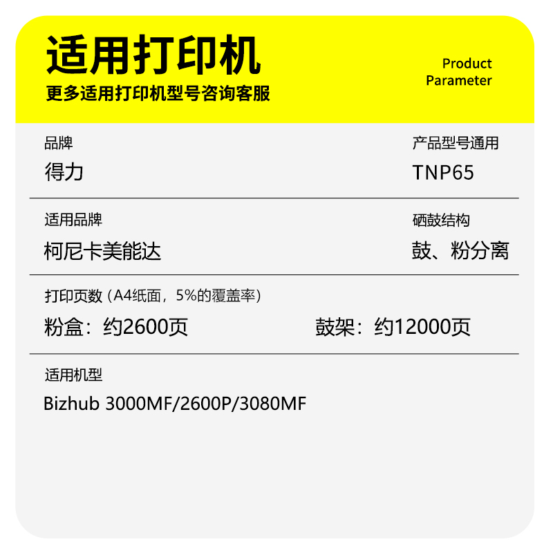 TNP65易加粉标准版 3080MF打印机墨盒成像鼓 粉盒 2600P 得力适用柯尼卡美能达TNP65易加粉粉盒3000mf