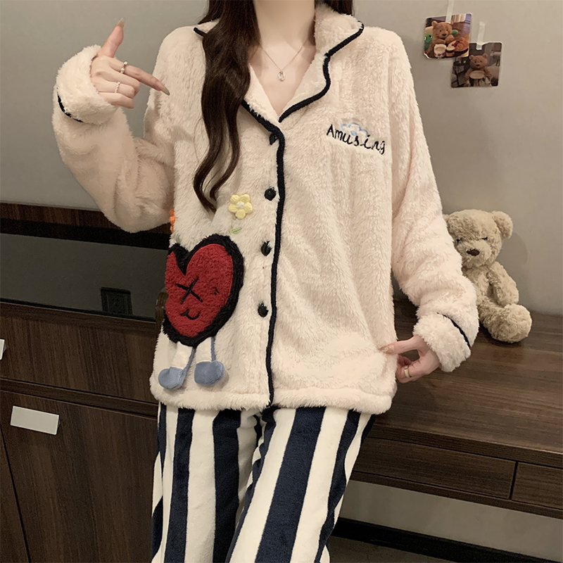 大码 春秋开衫 女士家居服 加厚珊瑚绒睡衣女冬法兰绒加绒套装 秋冬季
