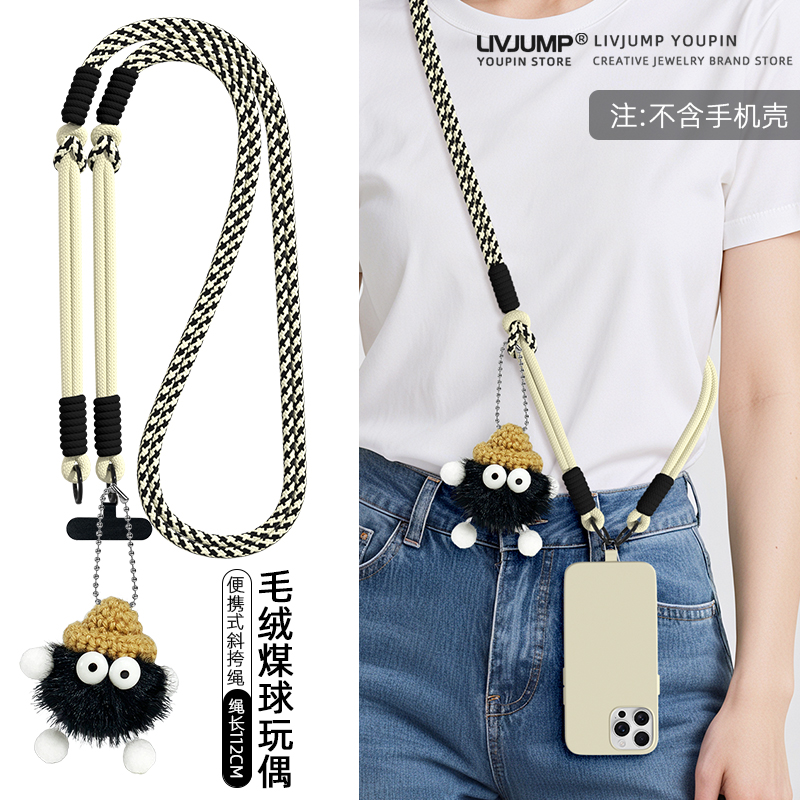 超萌小煤球貂毛可爱公仔手机挂绳长款 斜挎可肩背带撞色编织绳小众