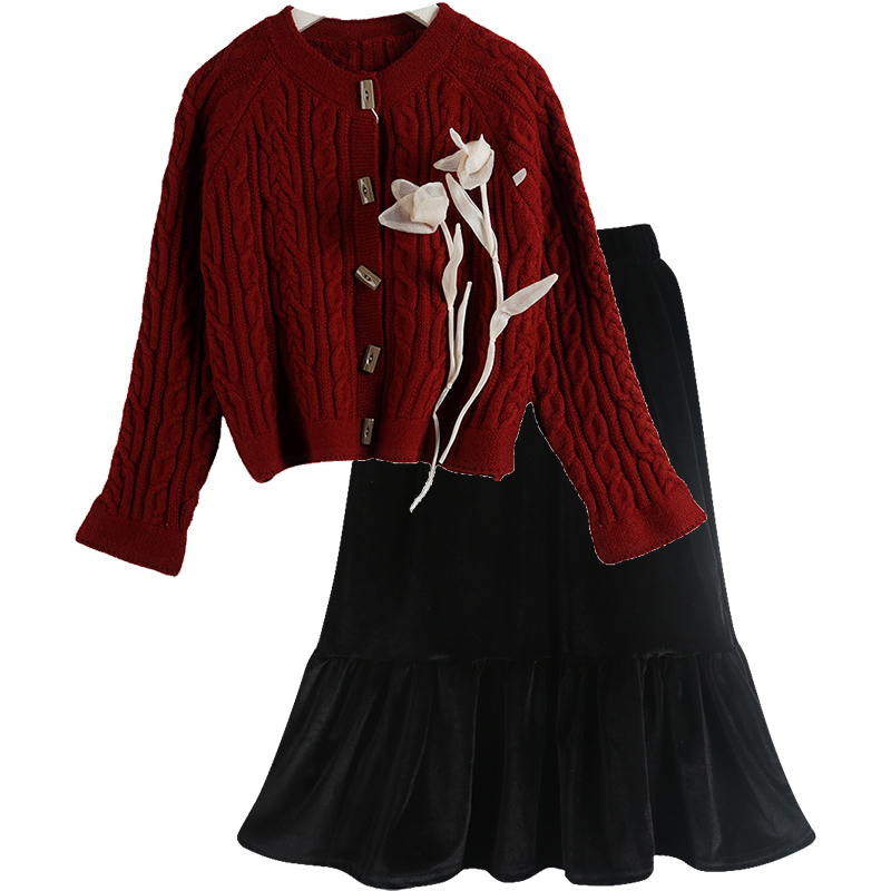 丝绒半身裙儿童洋气中大童秋装 秋冬套装 百搭毛衣开衫 韩版 女童新款
