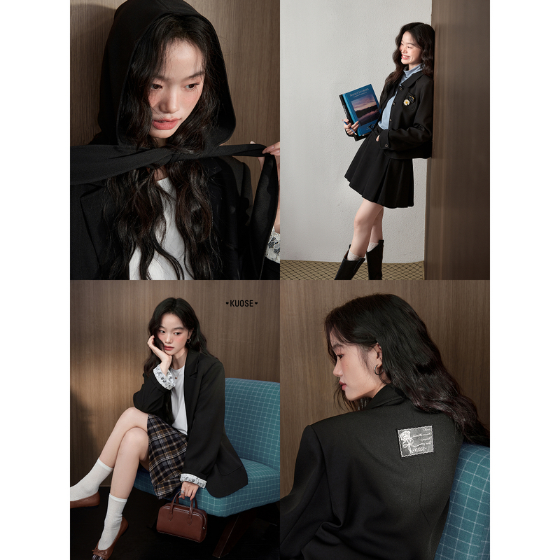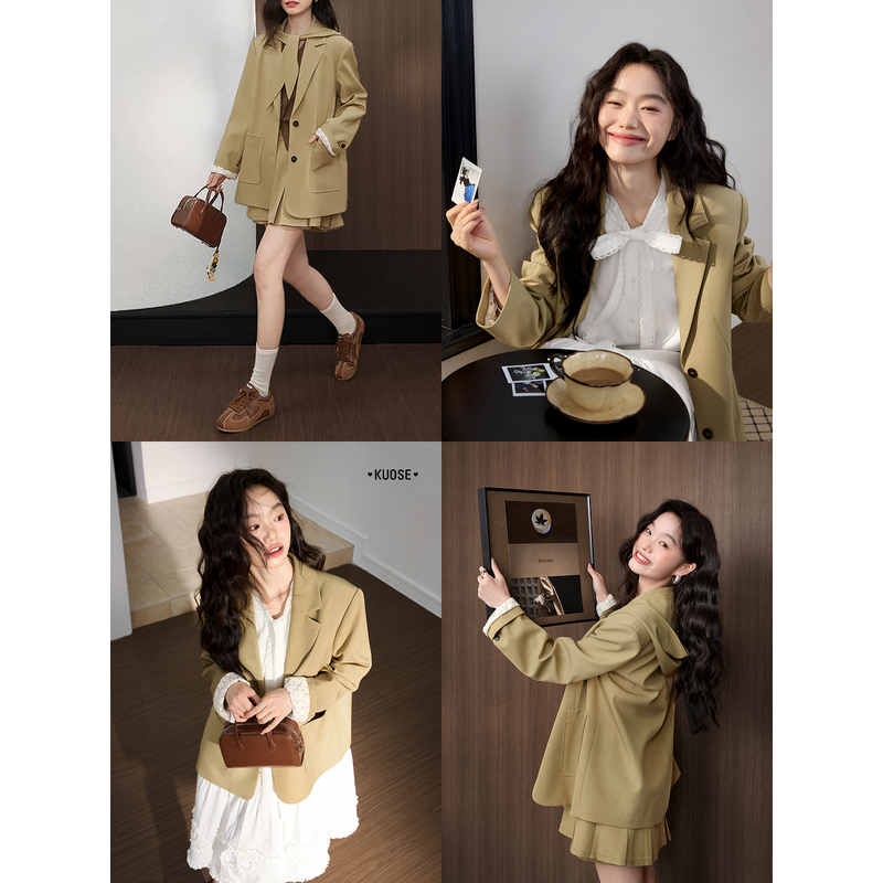 女外套短半裙子 25秋冬新款 阔色姜黄色连帽披肩西装 半身裙两件套装