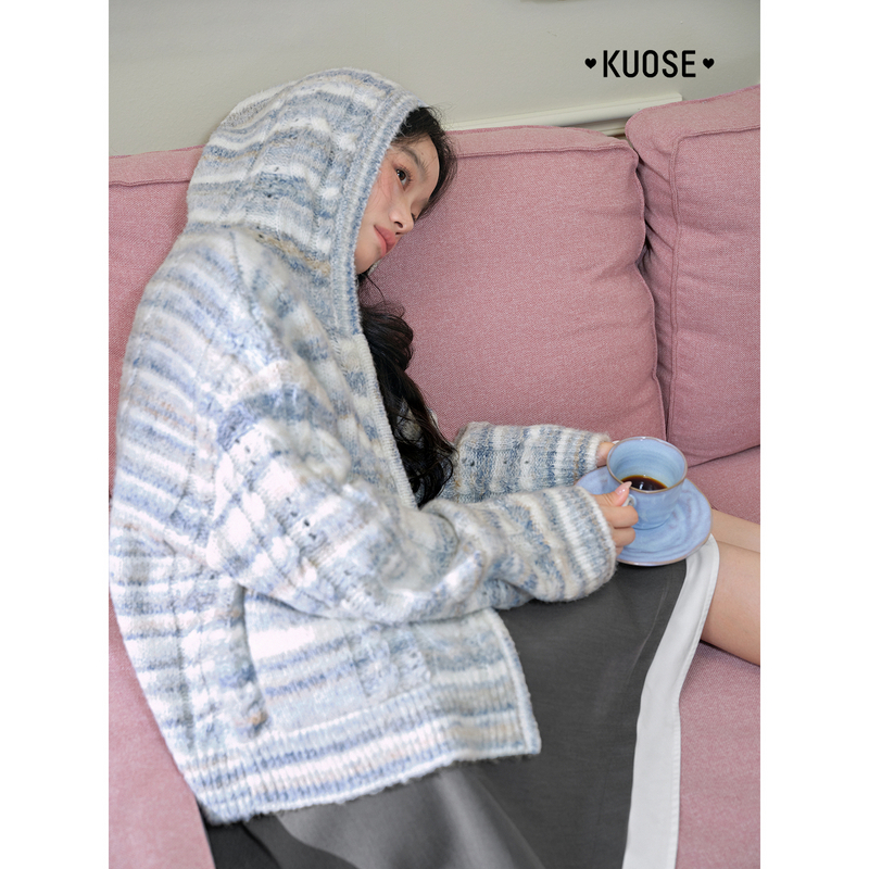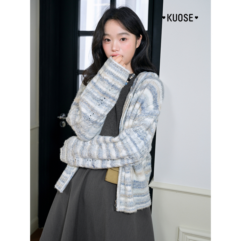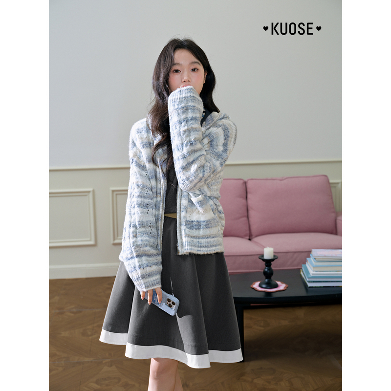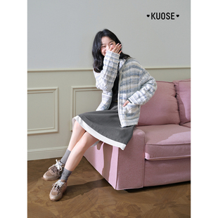 针织开衫 韩系宽松慵懒风显瘦长袖 新款 紫色格子拼接毛衣外套女秋季