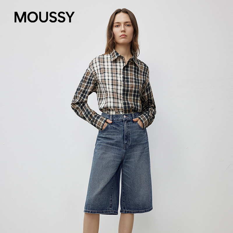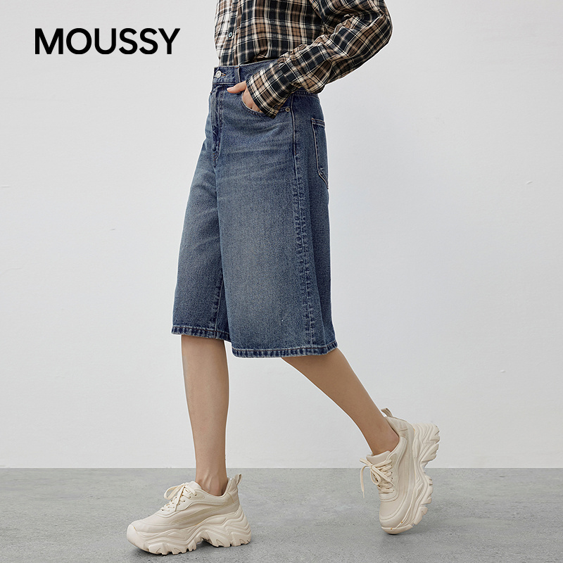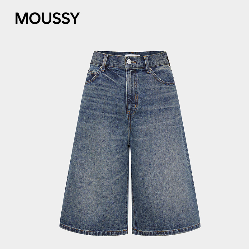 女028IAA11 MOUSSY 丹宁风复古做旧阔腿牛仔中裤 新品 1022 2025秋季