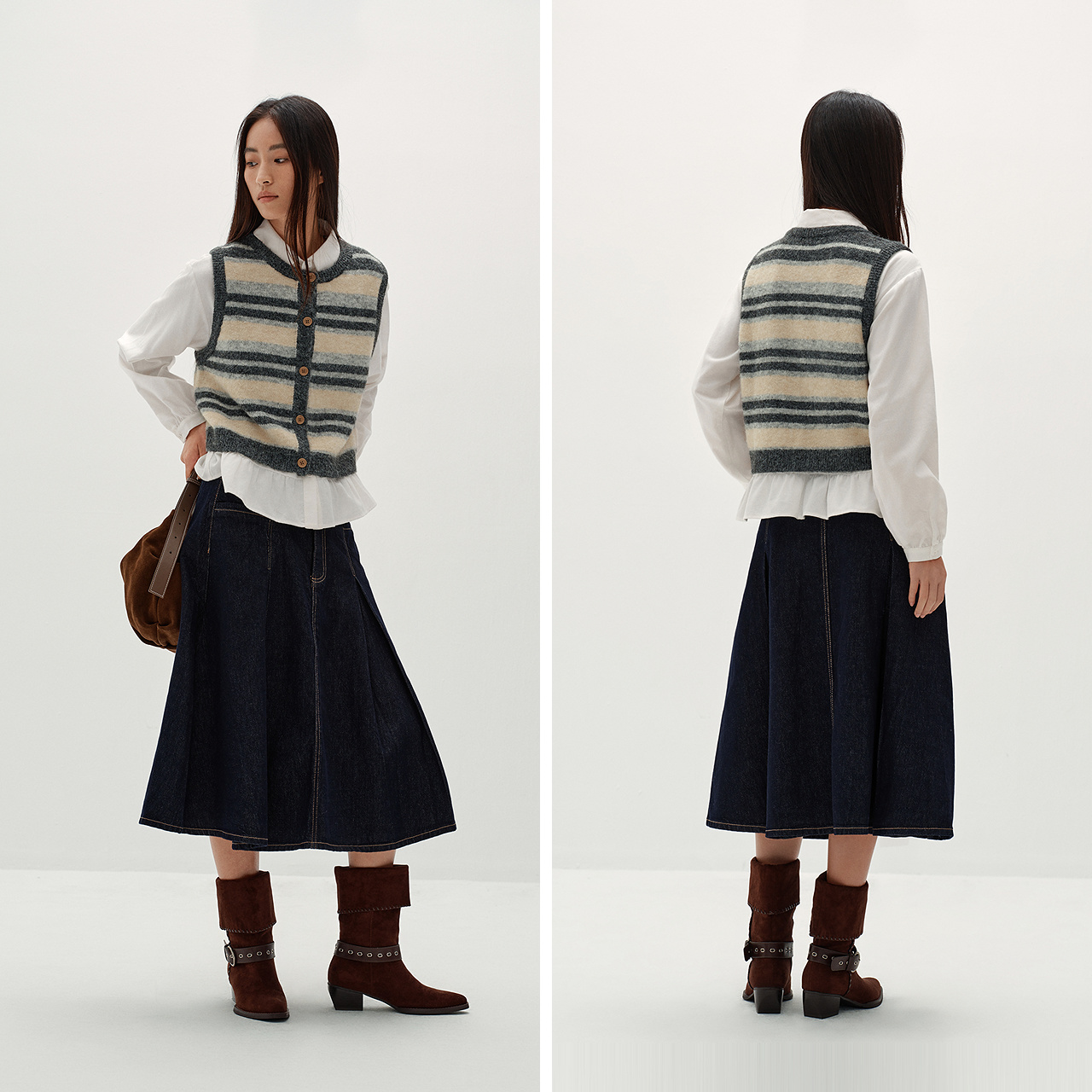 条纹短背心花边衬衣2025新款 商场同款 女冬季 衬衫 两件套 森马长袖