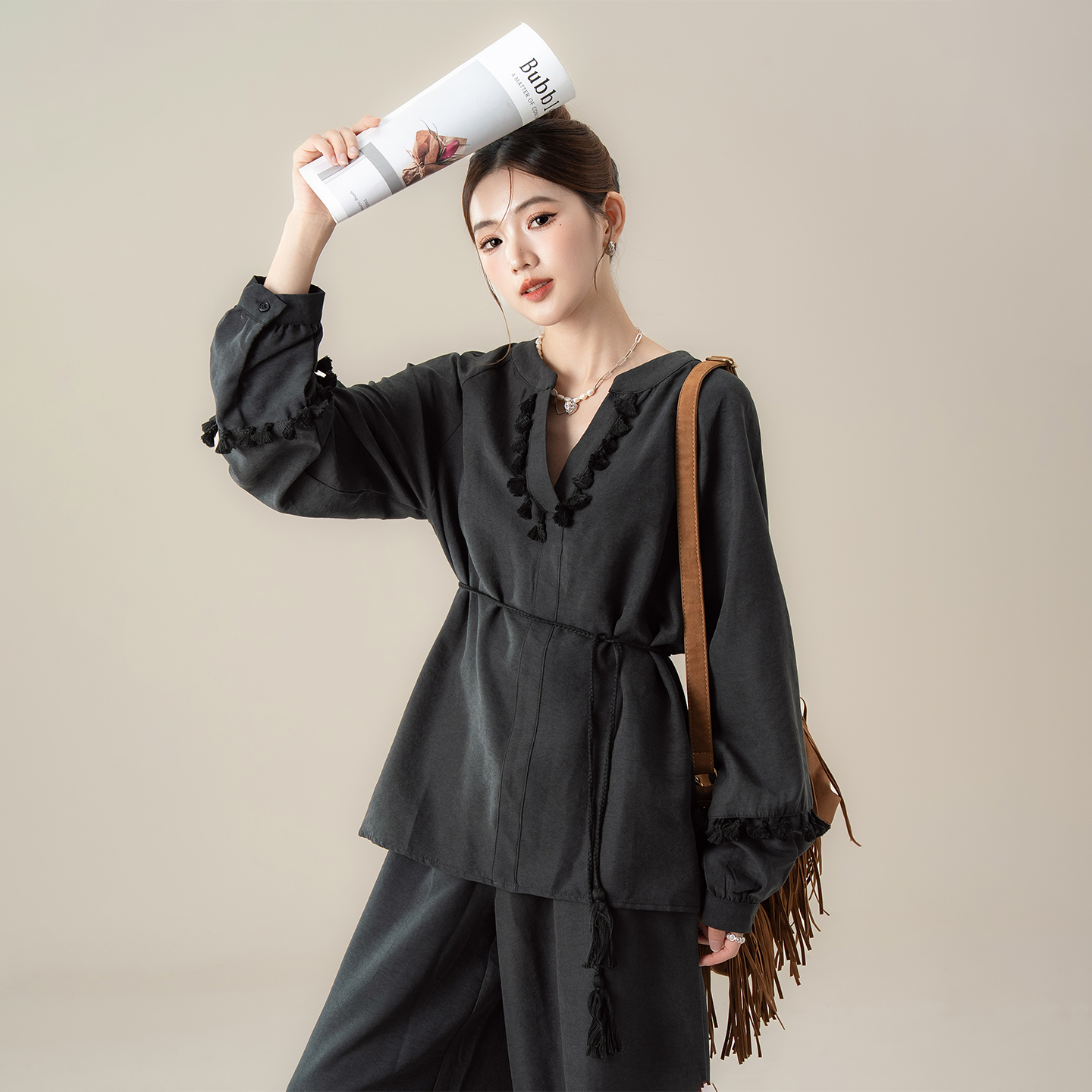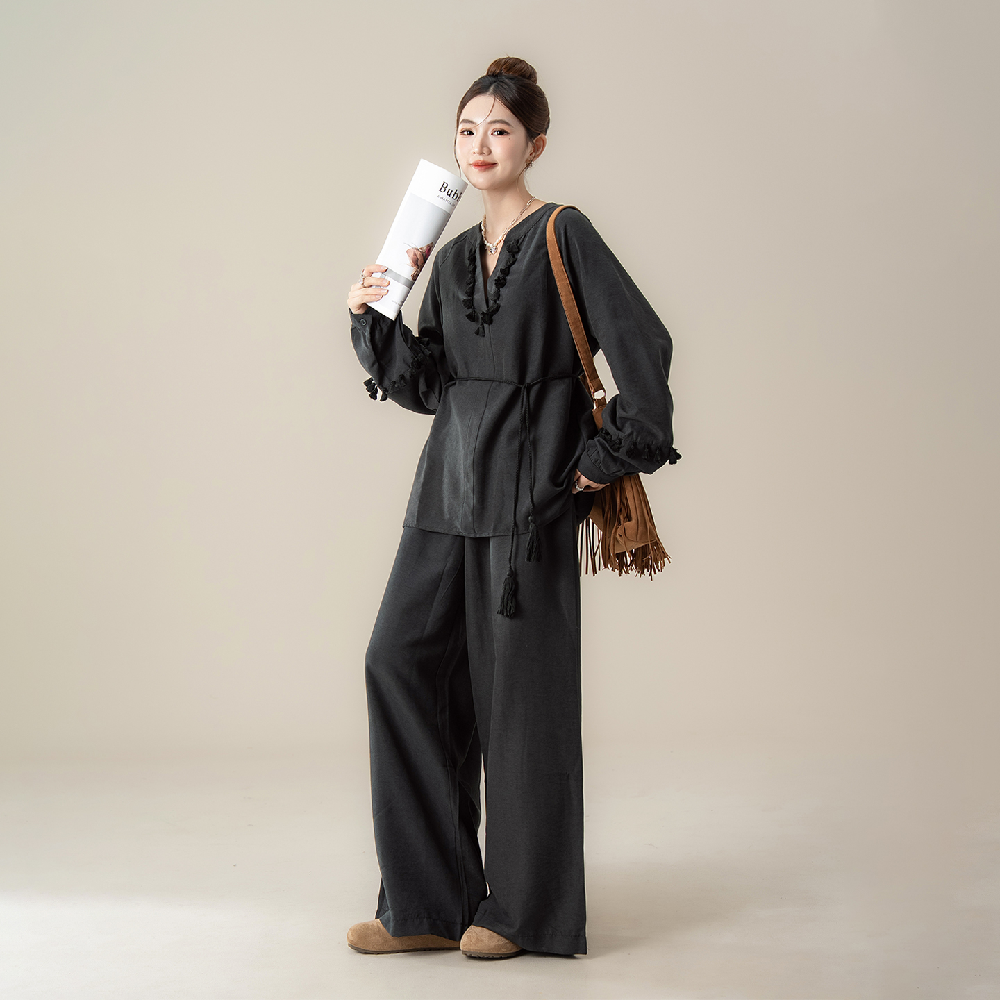 衬衫 子套装 女秋季 收腰上衣宽松阔腿裤 新款 黑色老钱风流苏拼接长袖