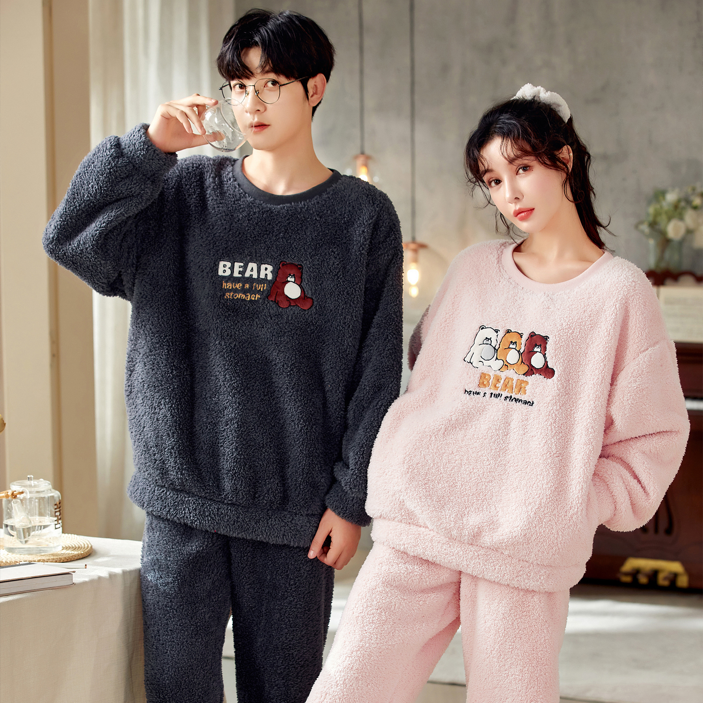 加厚加绒男女大学生家居服 情侣圆领珊瑚绒睡衣套装 2025秋冬季 新款