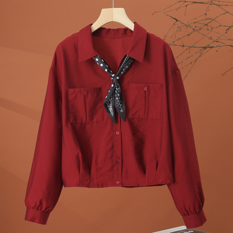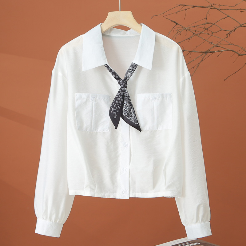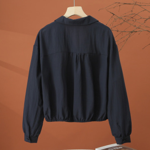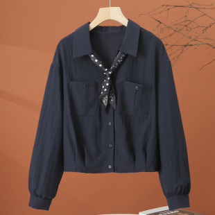 2025新款 女秋季 小个子衬衣秋装 时尚 上衣 丝巾翻领长袖 洋气短款 衬衫