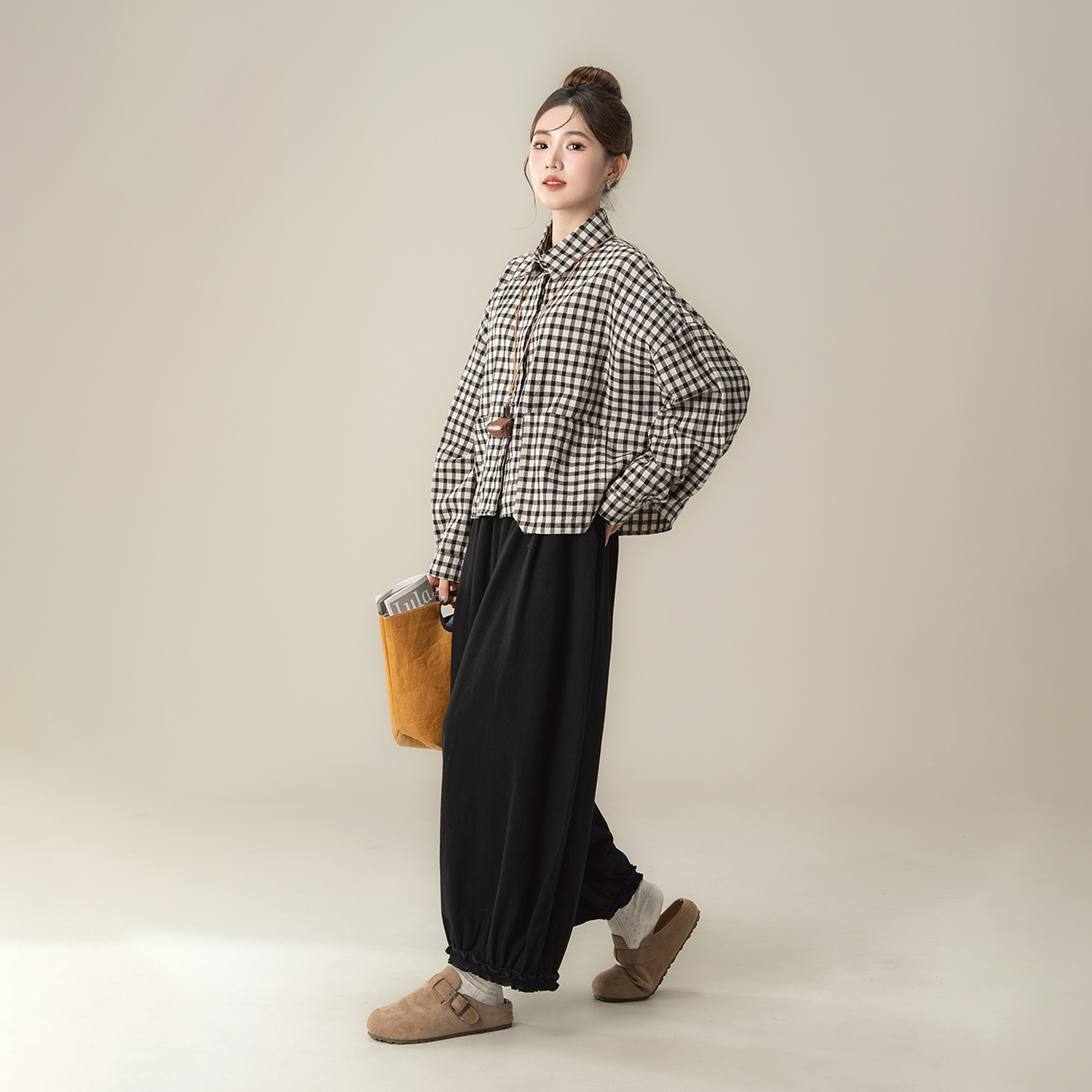 韩版 黑色复古格子长袖 新款 女秋季 宽松显瘦百搭减龄衬衣短上衣 衬衫