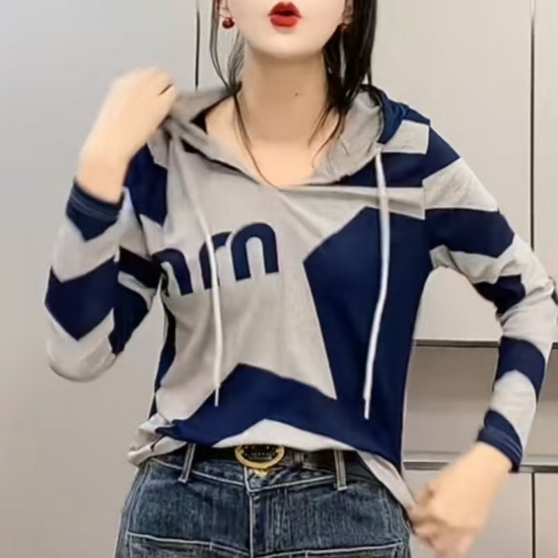 印花妈妈装 2025秋季 T恤女时尚 连帽长袖 宽松显瘦百搭休闲上衣 新款