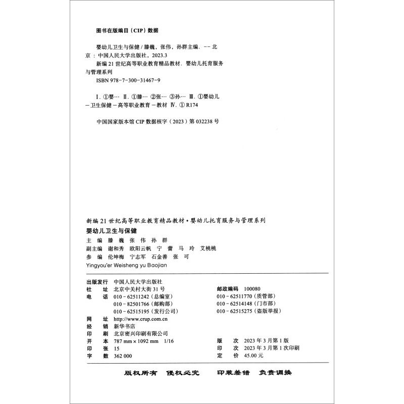 滕巍 婴幼儿托育服务与管理系列 张伟 孙群 社9787300314679 婴幼儿卫生与保健 中国人民大学出版 新编21世纪高等职业教育精品教材