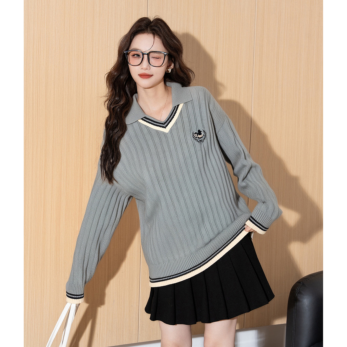 学院风撞色V领麻花毛衣女秋冬宽松慵懒软糯针织衫 上衣 高级感短款
