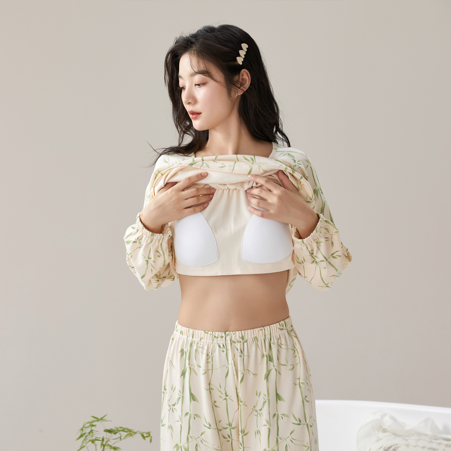 长裤 睡衣圆领舒适长袖 家居服高级带胸垫一体可外穿 女士新款 春秋季